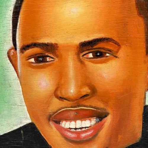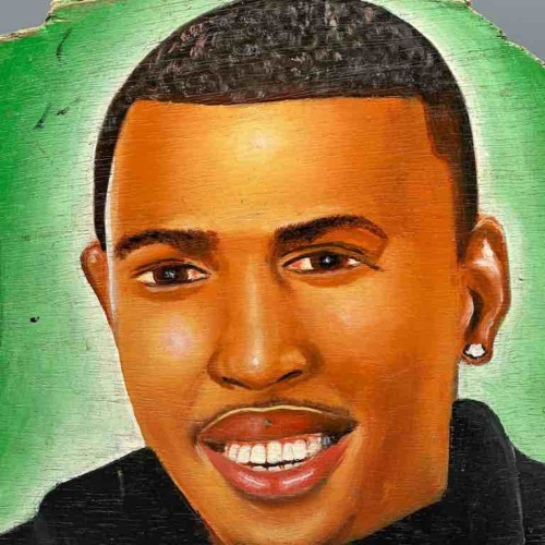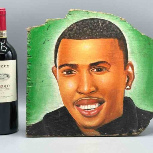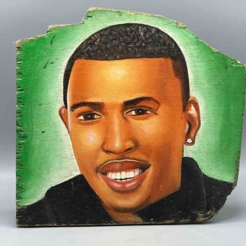 Two very similar portraits of Bobby Brown, one painted on each side of this small wooden sign fragment. This signboard may originally have been part of a larger sign. Was this part was removed from the original sign (perhaps that part was damaged in some way)?. It was in use when I found it and bought it from the barber. It could also be that an artist just used a small fragment of wood to paint similar portraits of Bobby Brown on both sides. Be that as it may, this is an exceptional artist’s rendition of a very popular American singer. 12 5/8″ wide x 11 7/8″ tall (32 x 30 cm)