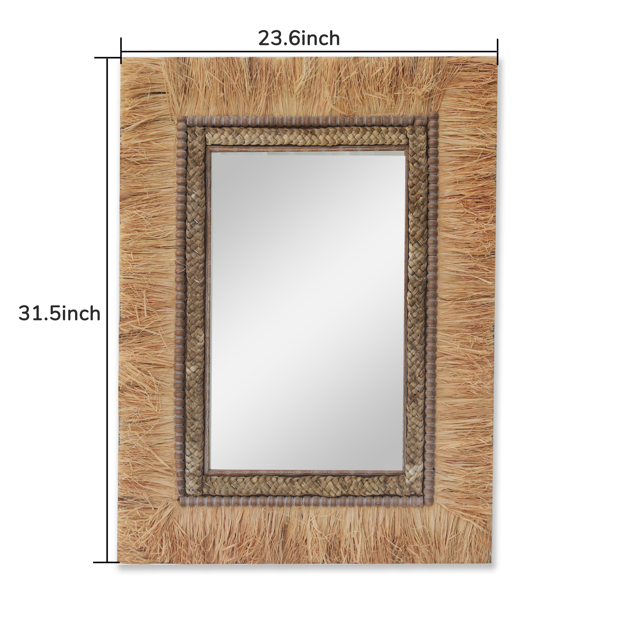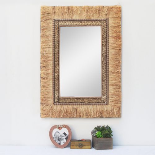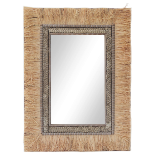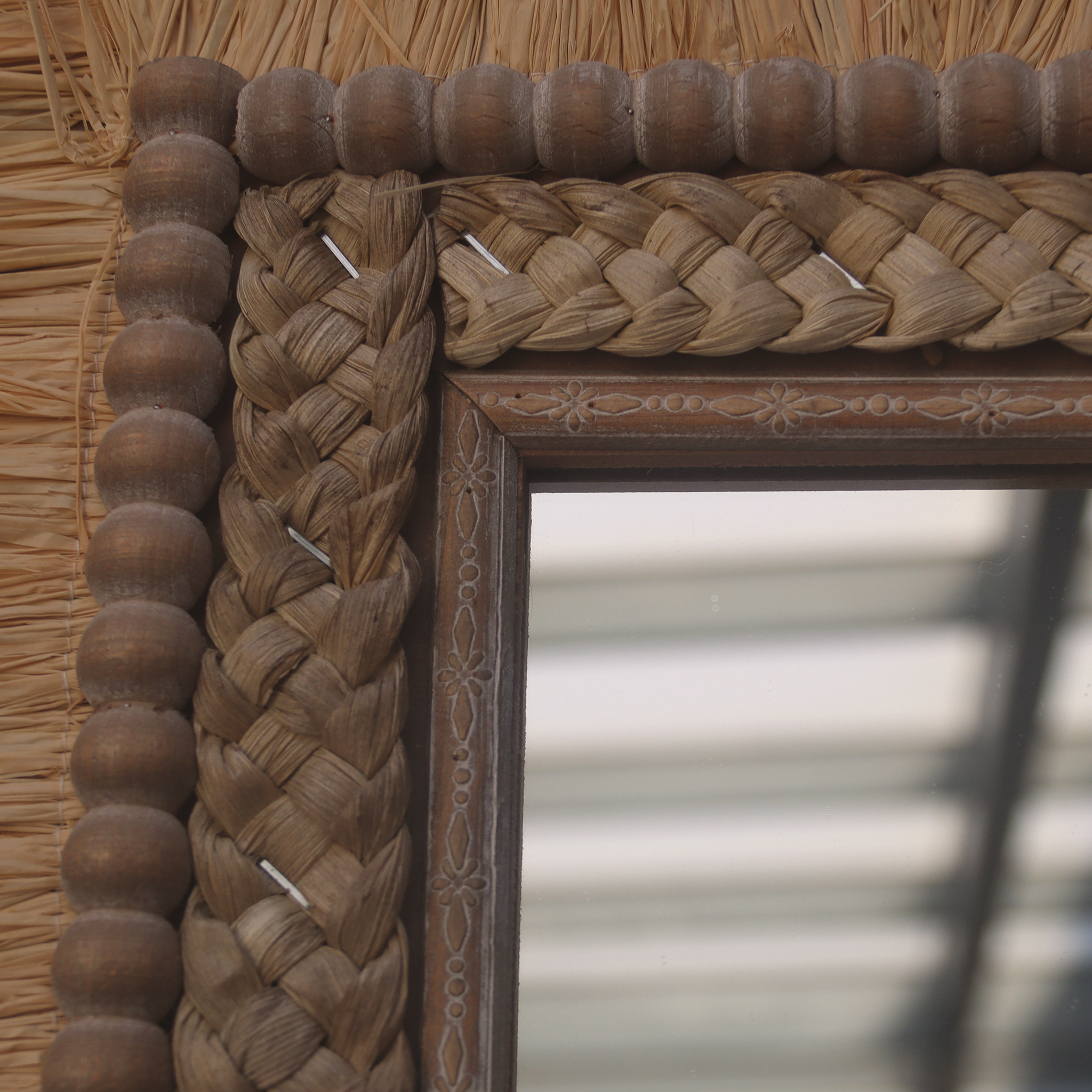 This mirror features a unique woven detail and dried raffia accents that create a stunning visual effect.
