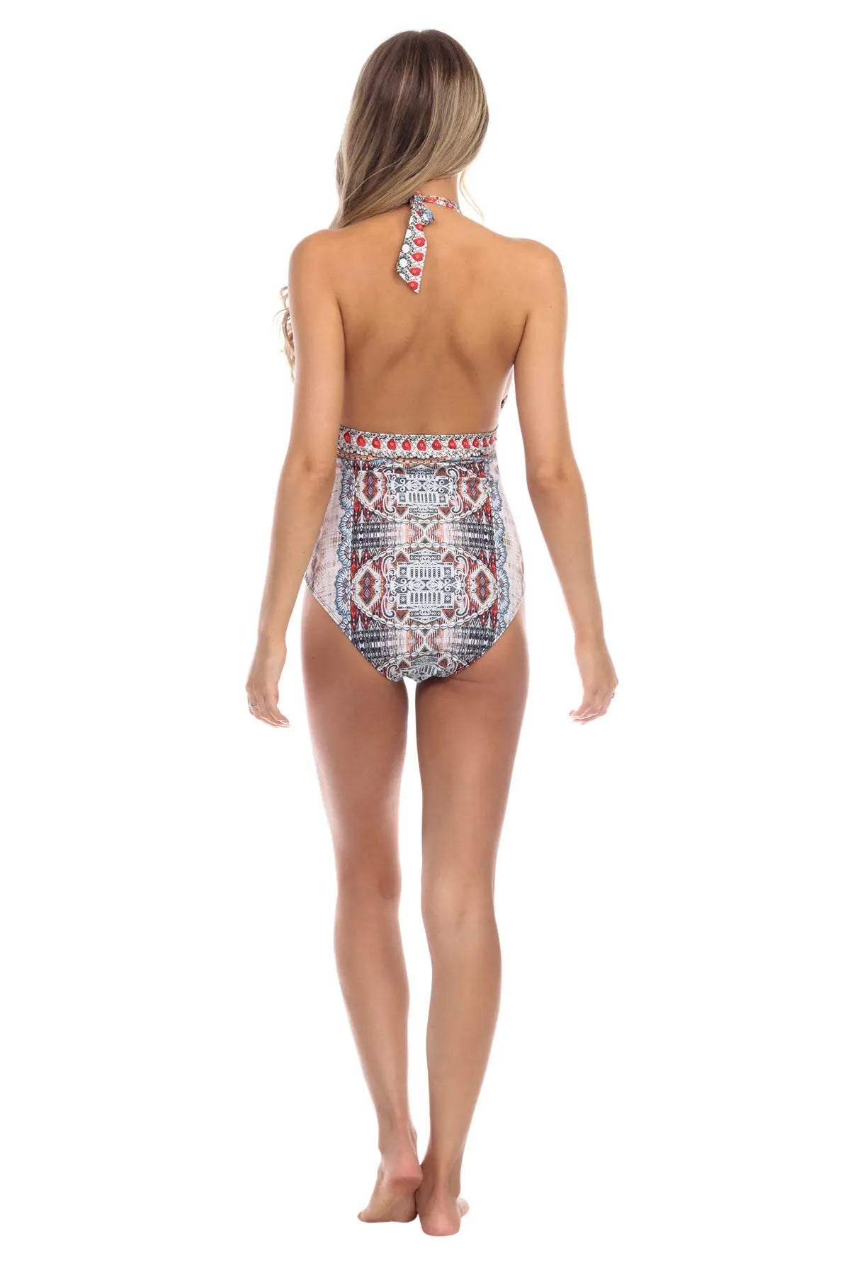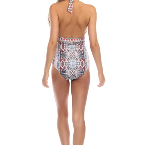 Boho Blissful Bohemian Plunge One-Piece Swimsuit. Bring out the bohemian babe in you! Deep neckline and empire waist. Beautiful colors pop in the boho print of this La Moda Boho Blissful one-piece swimsuit that brings feminine flair to your poolside attire with the strappy detail and plunging neckline. Make a splash with this one-piece swimsuit this summer. The monokini gives you ample coverage yet is sexy and flattering. The plunging neckline and strappy shoulders give the swimsuit structure. Look out for more at La Moda swimwear. One Piece Swim Suit, Monokini Beachwear Imported Nylon & Spandex Animal Print Size: S/M; L/XL Washing Instruction: Hand Wash with Cold Water, Tumble Dry, Do not Iron Material:Nylon/spandex. ImportedPack Details:1S, 1M, 1L, 1XL Matching Apparel in Boho Blissful Print