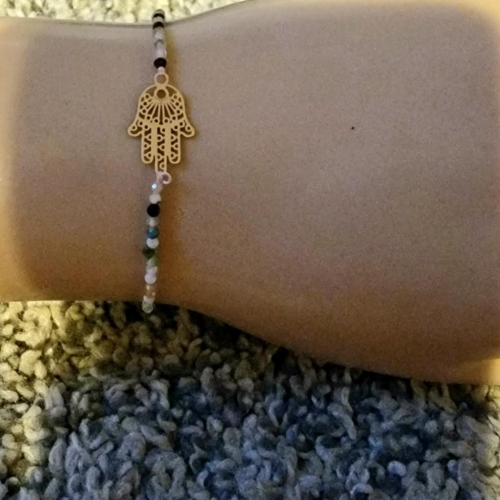 Boho Talisman Bracelet Hand of Fatima Wish Bracelet Rose Gold Boho Hand of Fatima Pull tie adjustable Bracelet Material – Polyester thread, Multi color Beads and copper. Length – Adjustable with slider tie Very Dainty and Pretty!