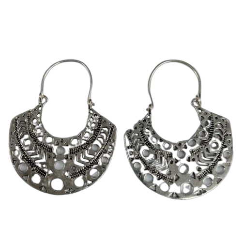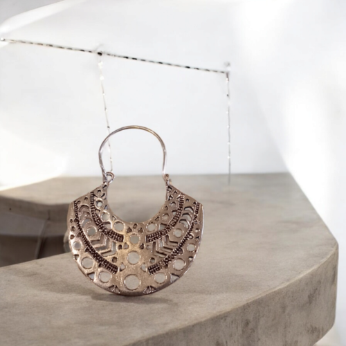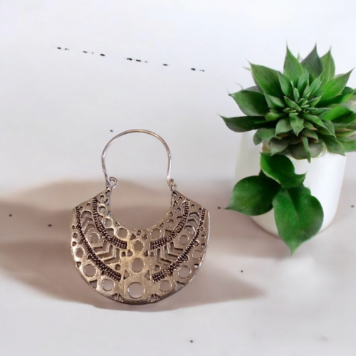 Bohotusk Half Circle Boho Plate Earrings GS Oxidised Silver. Closure with ear wire. Drop length: 5cm (2 inches) Length: 40 Millimetres Width: 50 Millimetres Materials: GS Metal Oxidised silver Location: Earlobe Closure: Ear wire