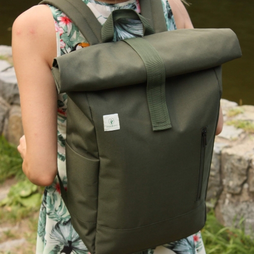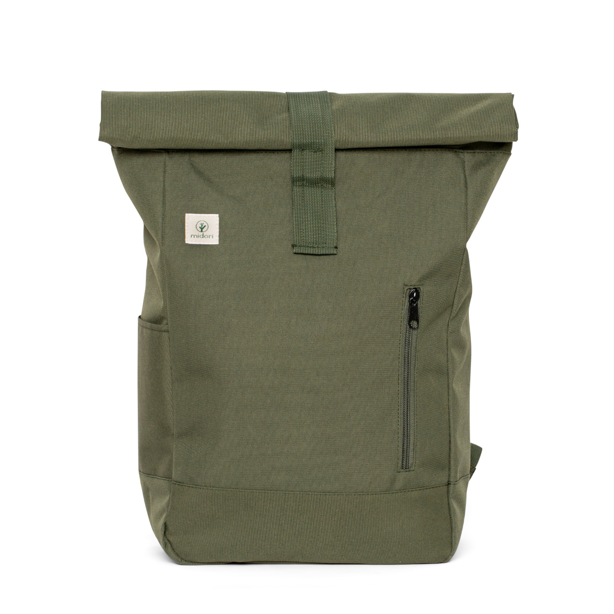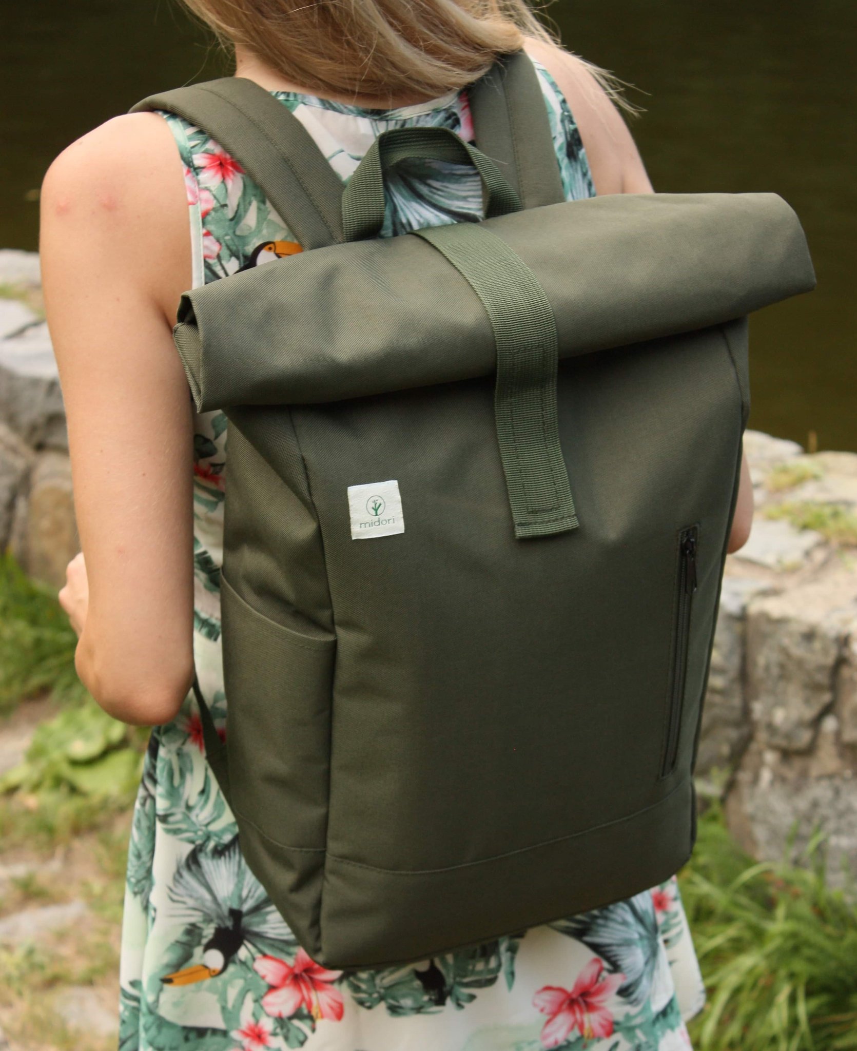 Midori’s Bonsai Rolltop backpack is made with 100% Recycled PET, both the interior and the exterior fabric.