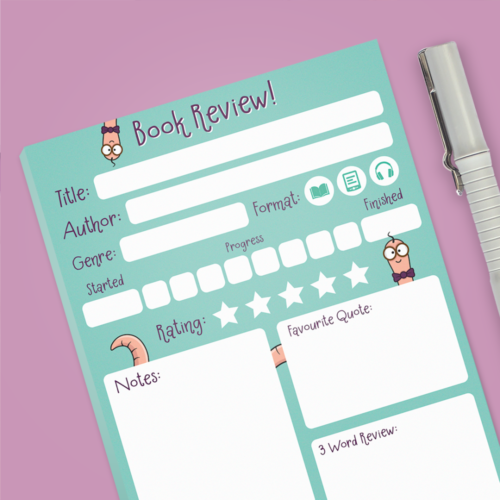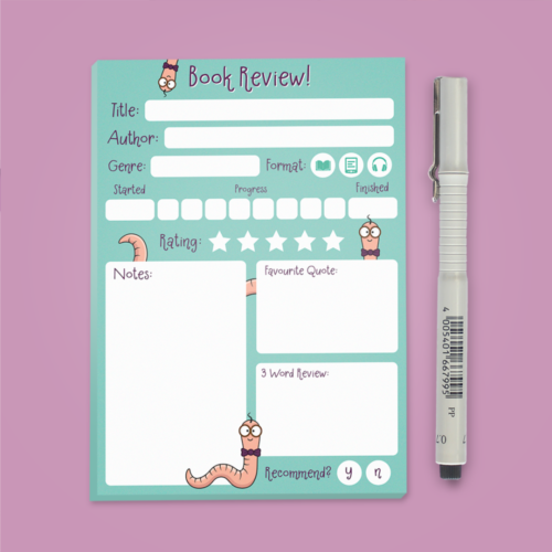 Featuring our cute bookworm mascot, This notepad includes space for everything you need to log your books and write your reviews!