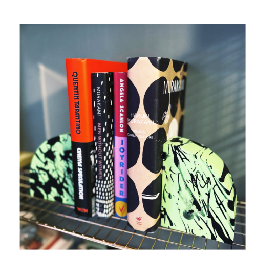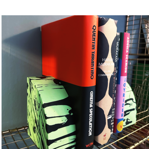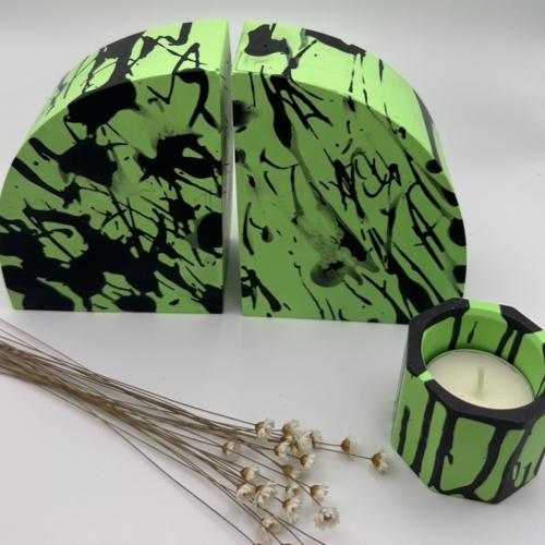 Green with black accents that look like dripping spray paint, this unique pair of book ends will bring the drama to any bookshelf in any room.