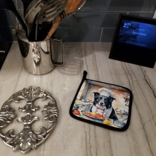 Pair of Pot Holders featuring breed specific Border Collie artwork. A Pair of Pot Holders to match your kitchen decor. Made in the USA these are thick and functional. Full color artwork decorates the front polyester fabric of the hot pad and accented by a black trim. Use these at as a trivet for your Thanksgiving or Christmas tablescape. Filled with insulated fabric and quilted for durability. These colorful pot holders will make a great gift for your favorite home cook or executive chef. Each pot holder measures approximately 7 1/2 inches by 7 1/2 inches. A hanging tab is included.