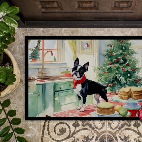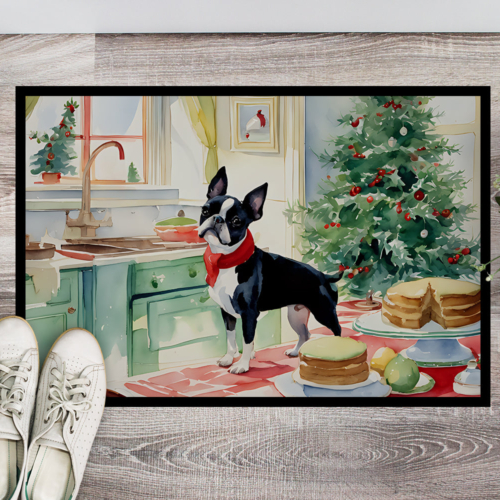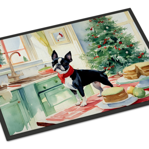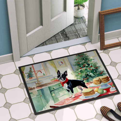 Doormat featuring breed specific Boston Terrier artwork. Celebrate Christmas with this Christmas Doormat. Welcome your guests in style with our Artwork Door Mat, designed to withstand almost any weather condition. This mat, measuring approximately 24 by 36 inches, is held together by durable black binding tape. Its top layer, composed of polyester felt, is dyed with the eye-catching image you see on the mat. A few layers below provide the mat with stability, while its rubber bottom is stamped to help prevent slipping and ensures safety. Our mat works wonderfully as both an indoor or outdoor door mat. For cleaning, simply hose it off with water or use a power washer – no need for any cleaner that produces suds. Avoid scrubbing with a brush, instead, opt for the vacuum on floor setting. Designed manufactured and printed in the USA, this mat is a perfect addition to your porch, outdoor kitchen, entryway, or any indoor space. Its unique design makes it a charming decorative rug that greets your guests and adds a stylish touch to your home decor.