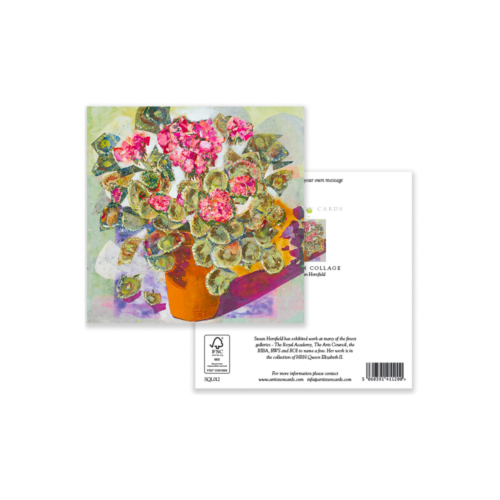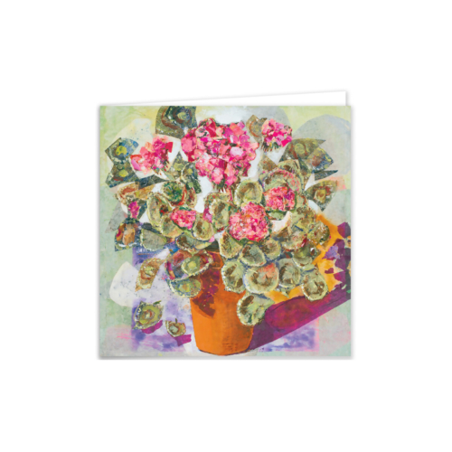 A bold, artistic collage card featuring vibrant pink geraniums in a textured, painterly style. This contemporary floral design makes a versatile addition to birthday, thank you, or general occasion ranges.