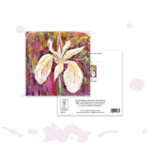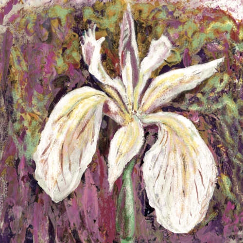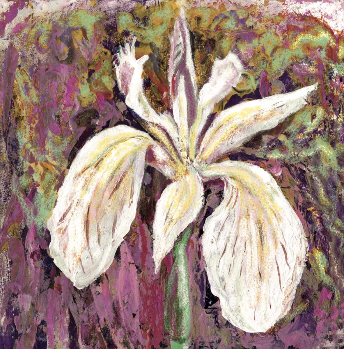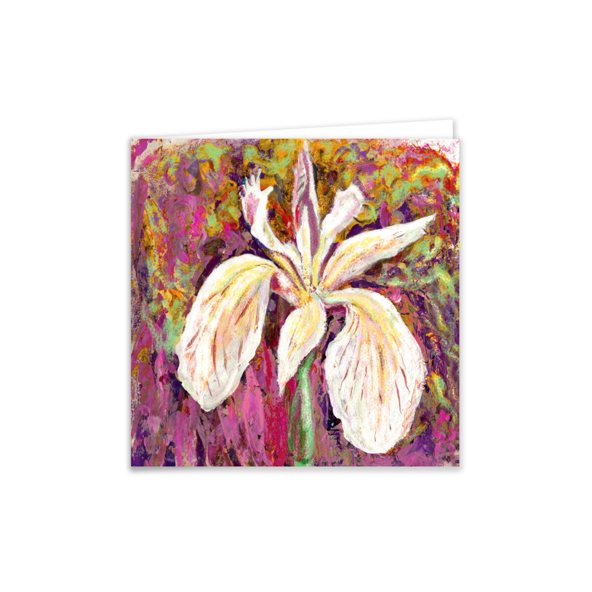 An artistic greeting card featuring a striking iris flower painted in expressive layered textured acrylics in white, yellow, and purple tones. A versatile floral design that works beautifully across occasions, appealing to customers looking for elegant botanical stationery.
