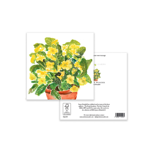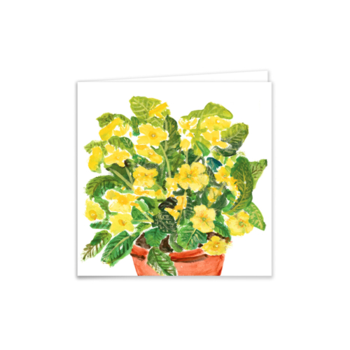 A botanical art greeting card featuring a watercolour print of a vibrant yellow primrose in a terracotta pot. Ideal for springtime occasions, birthdays, or everyday messages.