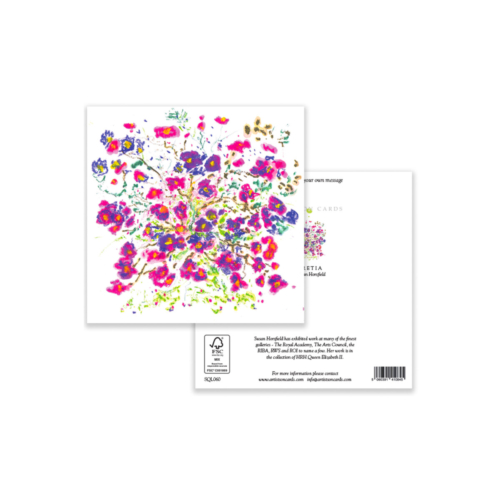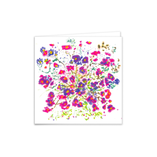 A colourful and textured design inspired by the lively beauty of aubretia meadow flowers in bloom. Created in pastels and inks, this bright floral contemporary artwork makes an uplifting and versatile greeting card for birthdays, thank you notes, and general everyday use.