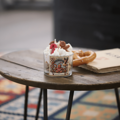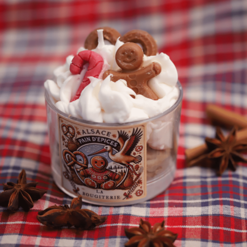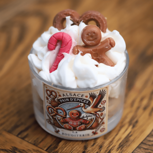Bougie chantilly Alsace pain d’épices : une gourmandise aux accents alsaciens Embarquez pour un voyage au cœur des traditions alsaciennes avec la bougie chantilly Alsace pain d’épices. Cette bougie unique, présentée dans un pot en verre, est décorée avec une cire en chantilly et agrémentée de petits symboles alsaciens : un bonhomme pain d’épices, des sapins, des cannes en sucre et des touches festives. Avec son parfum envoûtant de pain d’épices, elle recrée l’ambiance chaleureuse des marchés de Noël. Un design enchanteur Parfum pain d’épices : une senteur épicée et réconfortante qui évoque les fêtes de fin d’année. Cire chantilly : un rendu gourmand et élégant. Décorations festives : bonhomme pain d’épices, sapins et cannes en sucre pour un réalisme festif. Pot en verre : pratique et esthétique, parfait pour une ambiance raffinée. Une ode aux fêtes alsaciennes Ajoutez une touche d’authenticité et de charme à votre intérieur avec la bougie chantilly Alsace pain d’épices. Idéale pour décorer votre maison ou comme cadeau original pour célébrer la magie des fêtes en toute gourmandise.