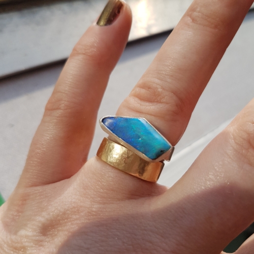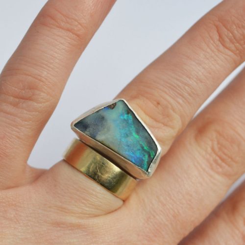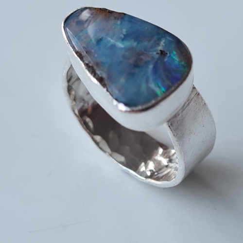 A beautiful raw boulder opal from Queensland, Australia, set in a simple silver rub-over setting: this one has sold but I make them to order so I can send you a photo of the opals I have available to make into a unique ring for you. The colours are so beautiful: I particularly the turquoise and blue shades with plenty of flashes in them. The shape and shade do vary a lot so it’s good to check you like the stone before I make it up for you: just let me know you ring size and I can make it to fit you perfectly. The dimensions of this one are around 14mm x 10mm pebble; the ring shank is 2mm wide round silver: dimensions will vary with each found piece of sea-glass or slate pebble. All my jewellery is giftwrapped in tissue or recycled giftboxes