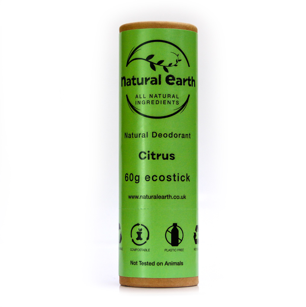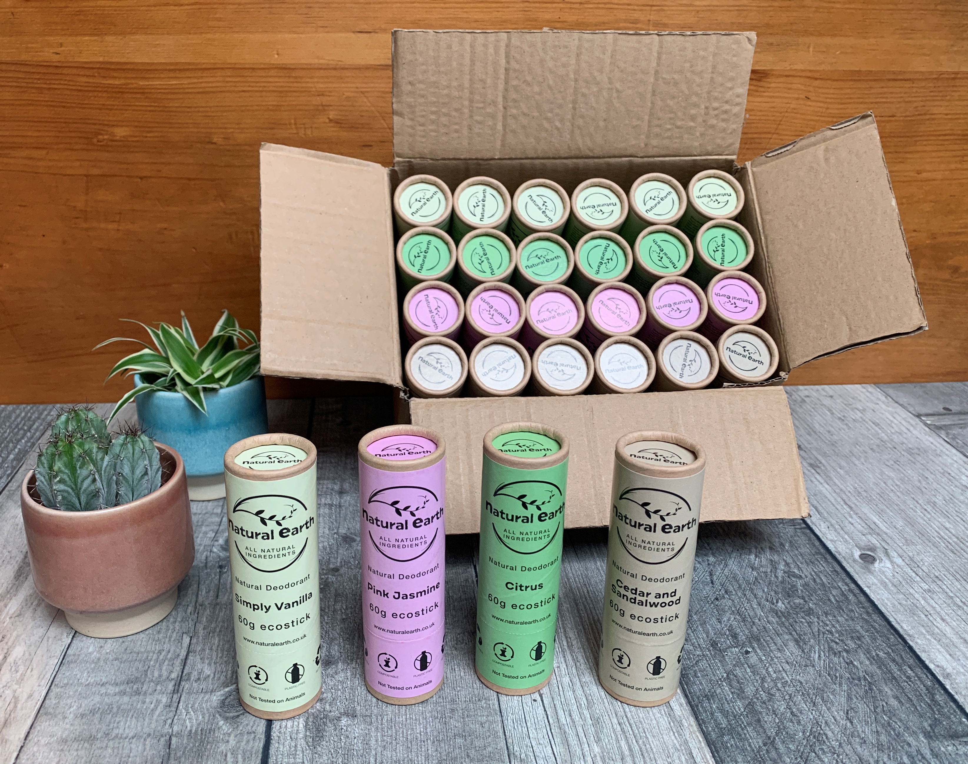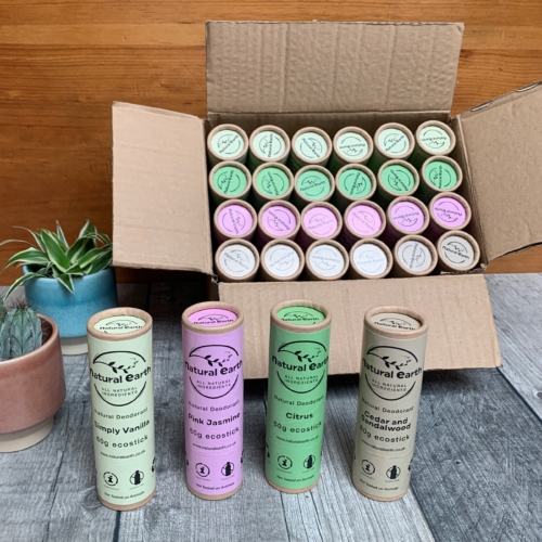 Box of 24 assorted vegan organic natural plastic free cardboard ecostick deodorants made up of 6 x 4 scents of Citrus, Cedar and Sandalwood, Pink Jasmine and Simply Vanilla. Retail price of each 60g deodorant is £8.