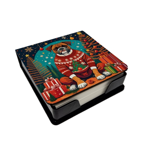 PU Leather Note Paper Holder featuring breed specific Boxer artwork. Celebrate Christmas with this Christmas Note Paper Holder. Elevate your workspace with this PU Leather Note Paper Holder, crafted to resemble luxurious leather without the use of animal products. Made from durable synthetic PU leather, it offers both a premium look and eco-friendly appeal. This note holder, compactly sized at 4.25 x 4.25 x 1.25 inches, includes about 160 sheets of 3.75 x 3.75-inch note paper—ideal for quick notes and reminders. An exclusive artist-designed cover makes each holder uniquely vibrant, adding a splash of color and personality to any desk or office. The discrete design keeps note paper hidden, maintaining a neat and organized workspace. Perfect as a gift or for personal use, this stylish holder is refillable with standard paper, ensuring long-lasting utility. A must-have for anyone seeking a sophisticated, artful touch to their workspace while supporting animal-friendly products. Add style, organization, and creativity to your everyday routine with this elegant note paper holder.