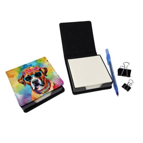 PU Leather Note Paper Holder featuring breed specific Boxer artwork. Elevate your workspace with this PU Leather Note Paper Holder, crafted to resemble luxurious leather without the use of animal products. Made from durable synthetic PU leather, it offers both a premium look and eco-friendly appeal. This note holder, compactly sized at 4.25 x 4.25 x 1.25 inches, includes about 160 sheets of 3.75 x 3.75-inch note paper—ideal for quick notes and reminders. An exclusive artist-designed cover makes each holder uniquely vibrant, adding a splash of color and personality to any desk or office. The discrete design keeps note paper hidden, maintaining a neat and organized workspace. Perfect as a gift or for personal use, this stylish holder is refillable with standard paper, ensuring long-lasting utility. A must-have for anyone seeking a sophisticated, artful touch to their workspace while supporting animal-friendly products. Add style, organization, and creativity to your everyday routine with this elegant note paper holder.
