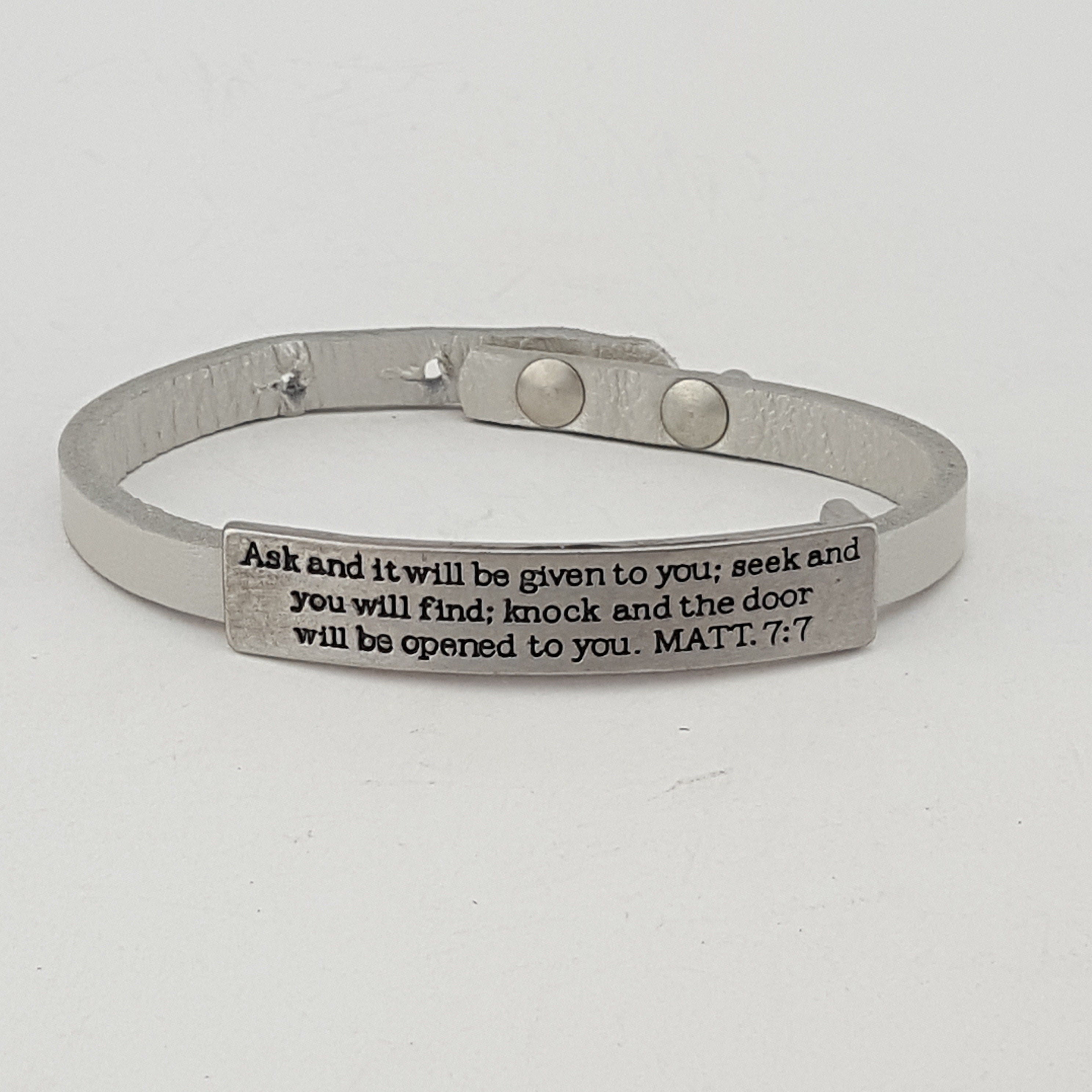 Single Leather Cuff with metal plate in matte silver engraved: Ask and it will be given to you….. MATT. 7:7 Width is 1/4″, Length is 8.5″. Two collar button for slight length adjustment 100% Leather in pearl silver leather