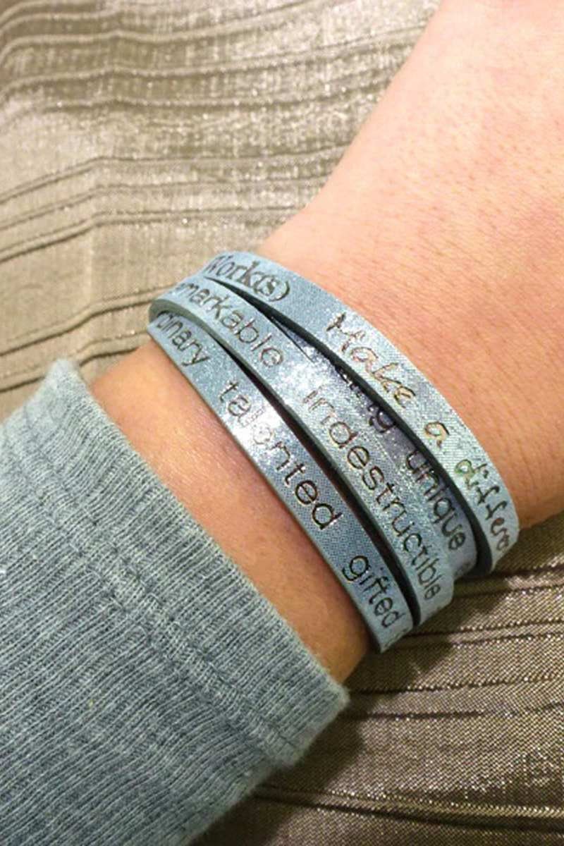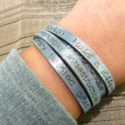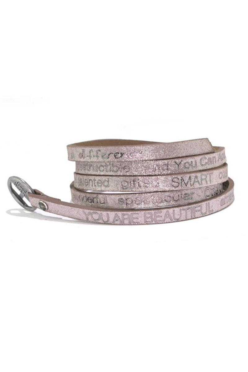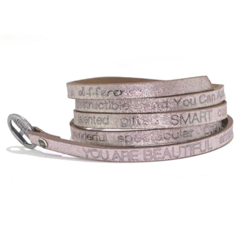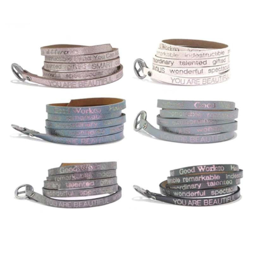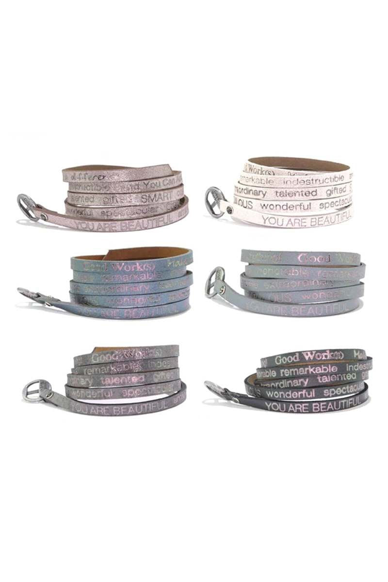 Price is for 6 leather wraps, Each wrap package in an organza pouch.Great Holiday GiftYou Are Beautiful Wrap Around Bracelet in Shimmering Leather is an everyday reminder that you are beautiful in every way!You are beautiful, amazing, unique, exceptional, fantastic, fabulous, wonderful, spectacular, one of a kind, special, awesome, extraordinary, talented, gifted, smart, courageous, strong, honorable, remarkable, indestructible, and you can accomplish anything!Length 36″ Adjustable to fit all size wristsLeather foil stamped with inspirational messages