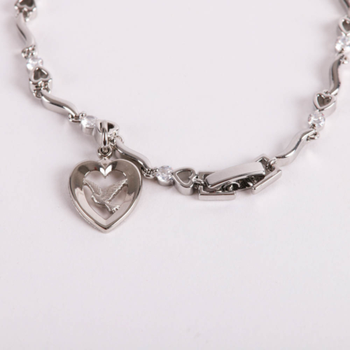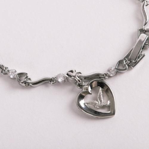 Each bracelet measures 7.25 inches, and are secured with a sturdy clasp for added peace of mind. The dove/heart pendant, measuring .625, exudes a subtle charm, adding a touch of sophistication to any outfit.