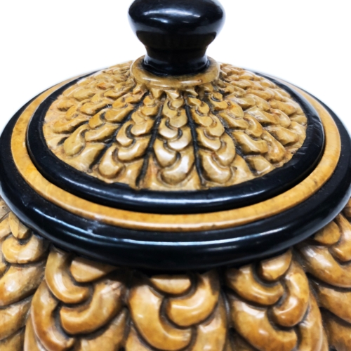 Soapstone is a soft rock that is capable of being carved and etched to great deal without fracturing. It is mined in the mountains of Quang Ninh in northern Viet Nam. Each box is a symbol of both the aesthetics and talent of the Vietnamese artisans. The soapstone is designed, carved and painted to produce a complete masterpiece. Each box consists of a variety of colors and shades, lines and curves, shapes and sizes which are handled with care by many different artisans. Every box takes hours to finish ultimately to become a one of a kind piece, truly a reflexion of the character of Vietnam you cannot find anywhere else. Though it is rock, the soapstone is fragile and will break if it is dropped. It will be shipped to you in a box surrounded by bubble-wrap to ensure its safety. This sculpture measures 11 x 11 cm (4.3 x 4.3″) Enjoy.