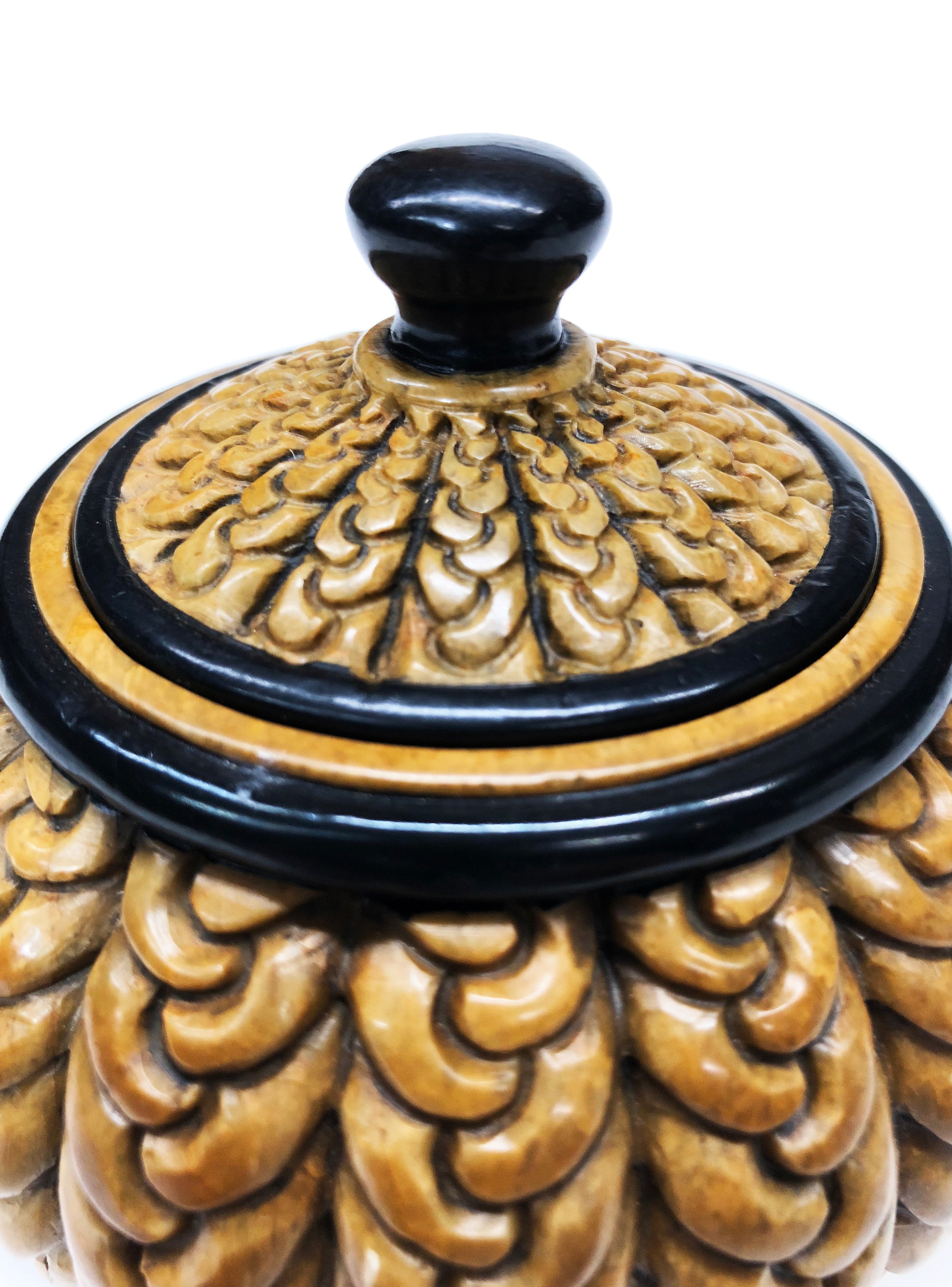 Soapstone is a soft rock that is capable of being carved and etched to great deal without fracturing. It is mined in the mountains of Quang Ninh in northern Viet Nam. Each box is a symbol of both the aesthetics and talent of the Vietnamese artisans. The soapstone is designed, carved and painted to produce a complete masterpiece. Each box consists of a variety of colors and shades, lines and curves, shapes and sizes which are handled with care by many different artisans. Every box takes hours to finish ultimately to become a one of a kind piece, truly a reflexion of the character of Vietnam you cannot find anywhere else. Though it is rock, the soapstone is fragile and will break if it is dropped. It will be shipped to you in a box surrounded by bubble-wrap to ensure its safety. This sculpture measures 11 x 11 cm (4.3 x 4.3″) Enjoy.