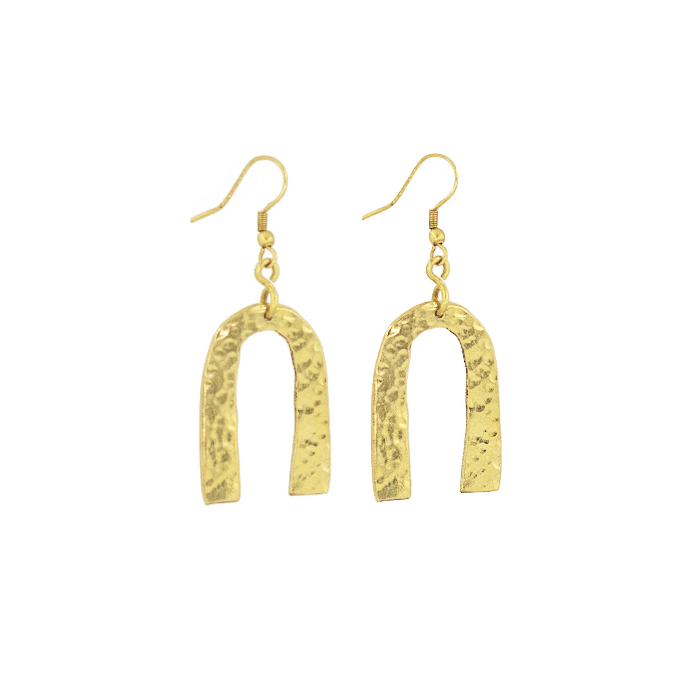 Product Details: Material: Up-cycled Brass Color: Golden Gender: Female Earring Measurement (including drop): 5–5.5 cm Origin: African Handmade in Kenya Design: Sleek arch silhouette with minimalist elegance
