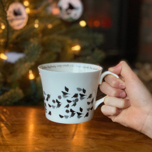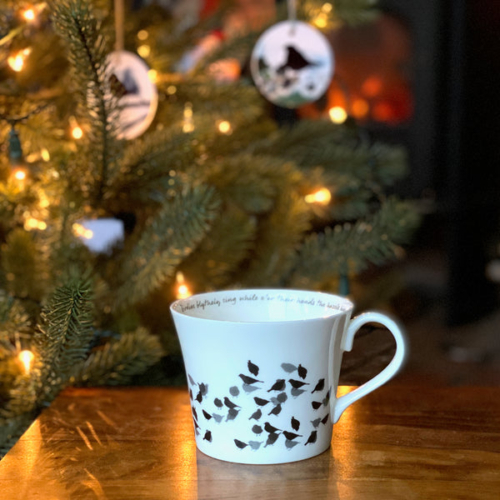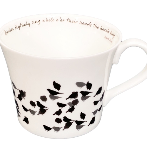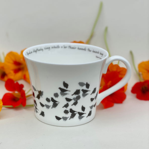 A large bone china breakfast cup with chaffinch design and words from Robert Burns.