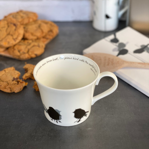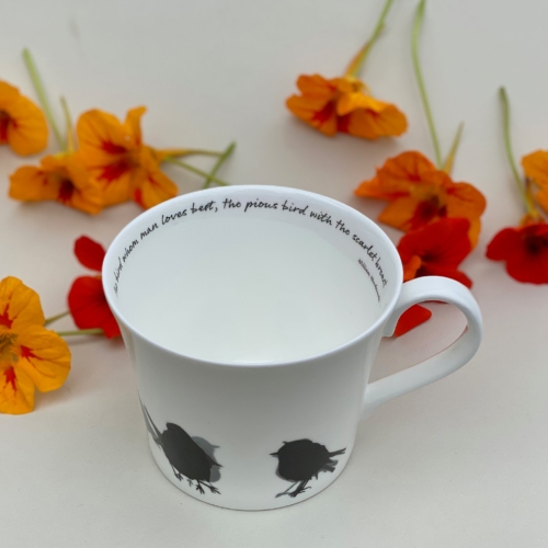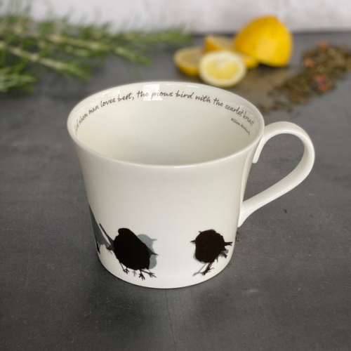 A large bone china breakfast cup with robin design and wording by William Wordsworth.