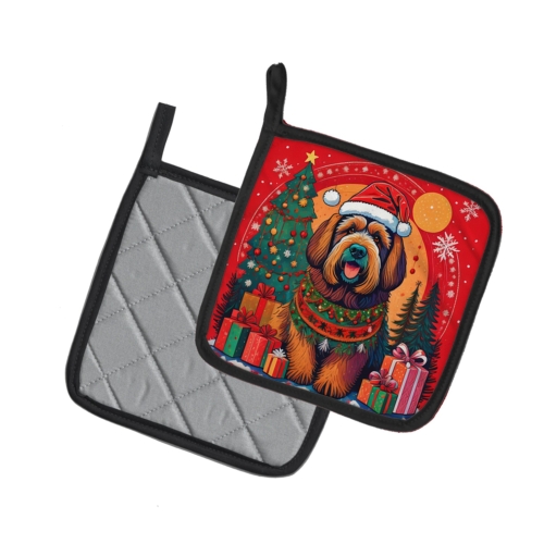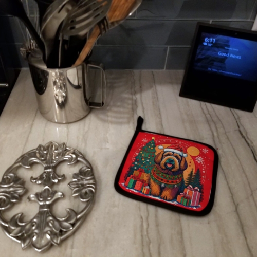 Pair of Pot Holders featuring breed specific Briard artwork. Celebrate Christmas with this Christmas Pair of Pot Holders. A Pair of Pot Holders to match your kitchen decor. Made in the USA these are thick and functional. Full color artwork decorates the front polyester fabric of the hot pad and accented by a black trim. Use these at as a trivet for your Thanksgiving or Christmas tablescape. Filled with insulated fabric and quilted for durability. These colorful pot holders will make a great gift for your favorite home cook or executive chef. Each pot holder measures approximately 7 1/2 inches by 7 1/2 inches. A hanging tab is included.