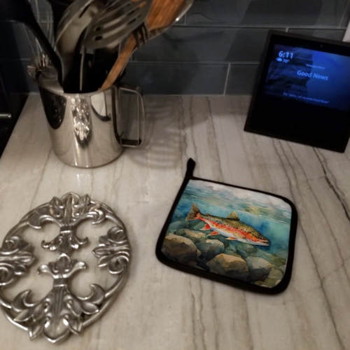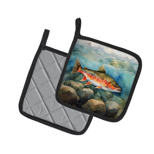 Pair of Pot Holders featuring breed specific Brook Trout artwork. A Pair of Pot Holders to match your kitchen decor. Made in the USA these are thick and functional. Full color artwork decorates the front polyester fabric of the hot pad and accented by a black trim. Use these at as a trivet for your Thanksgiving or Christmas tablescape. Filled with insulated fabric and quilted for durability. These colorful pot holders will make a great gift for your favorite home cook or executive chef. Each pot holder measures approximately 7 1/2 inches by 7 1/2 inches. A hanging tab is included.