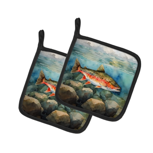 Pair of Pot Holders featuring breed specific Brook Trout artwork. A Pair of Pot Holders to match your kitchen decor. Made in the USA these are thick and functional. Full color artwork decorates the front polyester fabric of the hot pad and accented by a black trim. Use these at as a trivet for your Thanksgiving or Christmas tablescape. Filled with insulated fabric and quilted for durability. These colorful pot holders will make a great gift for your favorite home cook or executive chef. Each pot holder measures approximately 7 1/2 inches by 7 1/2 inches. A hanging tab is included.
