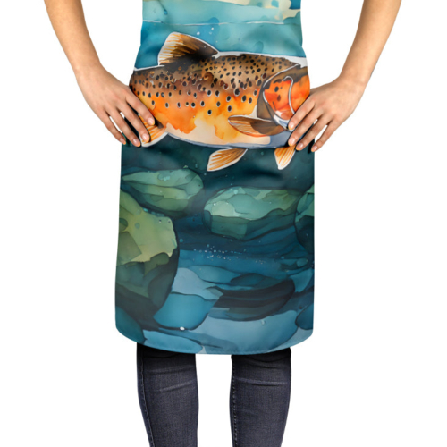 Apron featuring breed specific Brown Trout artwork. Elevate your cooking, baking, and grilling experiences with our versatile Kitchen or BBQ Apron. This Bib Style apron isn’t just limited to culinary activities – it also serves as an excellent baking apron, artist apron, server apron, gardening apron, or even a dog grooming apron. The apron showcases vibrant full-color artwork contributed by one of our talented artists, bringing a dash of style to your daily tasks. With dimensions of approximately 27″W x 30″H, it provides ample coverage to protect your clothing from spills and splashes. Our apron is meticulously crafted from 100% Ultra Spun Polyester, known for its durability and lightweight nature. The apron comes with white tie straps, ensuring a comfortable and adjustable fit for all. It’s a perfect choice for kitchen apron enthusiasts, whether you are a woman or a man. Designed for easy maintenance, this apron is fully machine washable. The quick-drying polyester material actively reduces staining, keeping your apron looking fresh and new for longer. Our beautifully designed apron isn’t just a functional kitchen accessory – it’s a fashion statement in the culinary world!