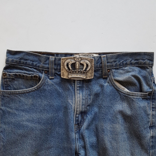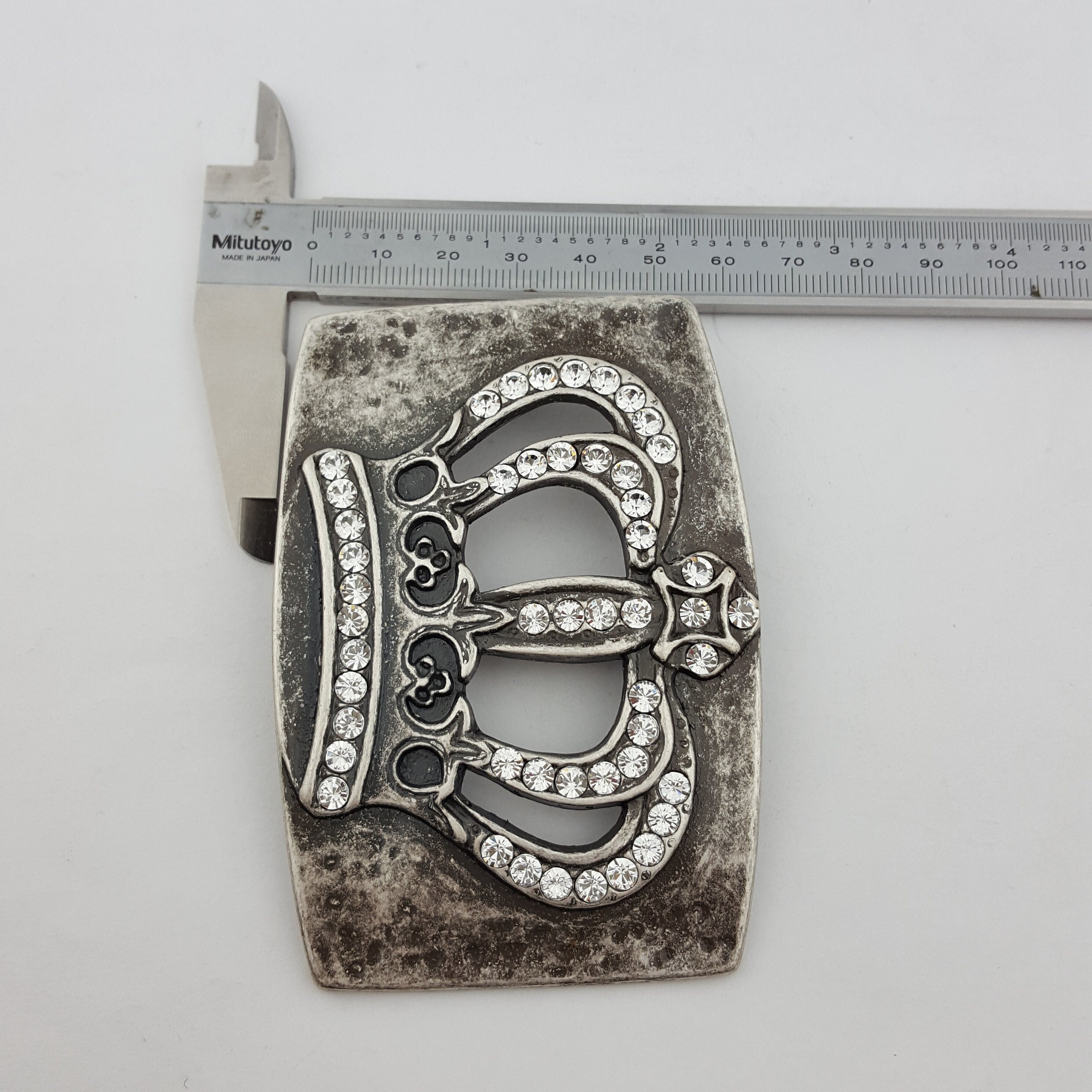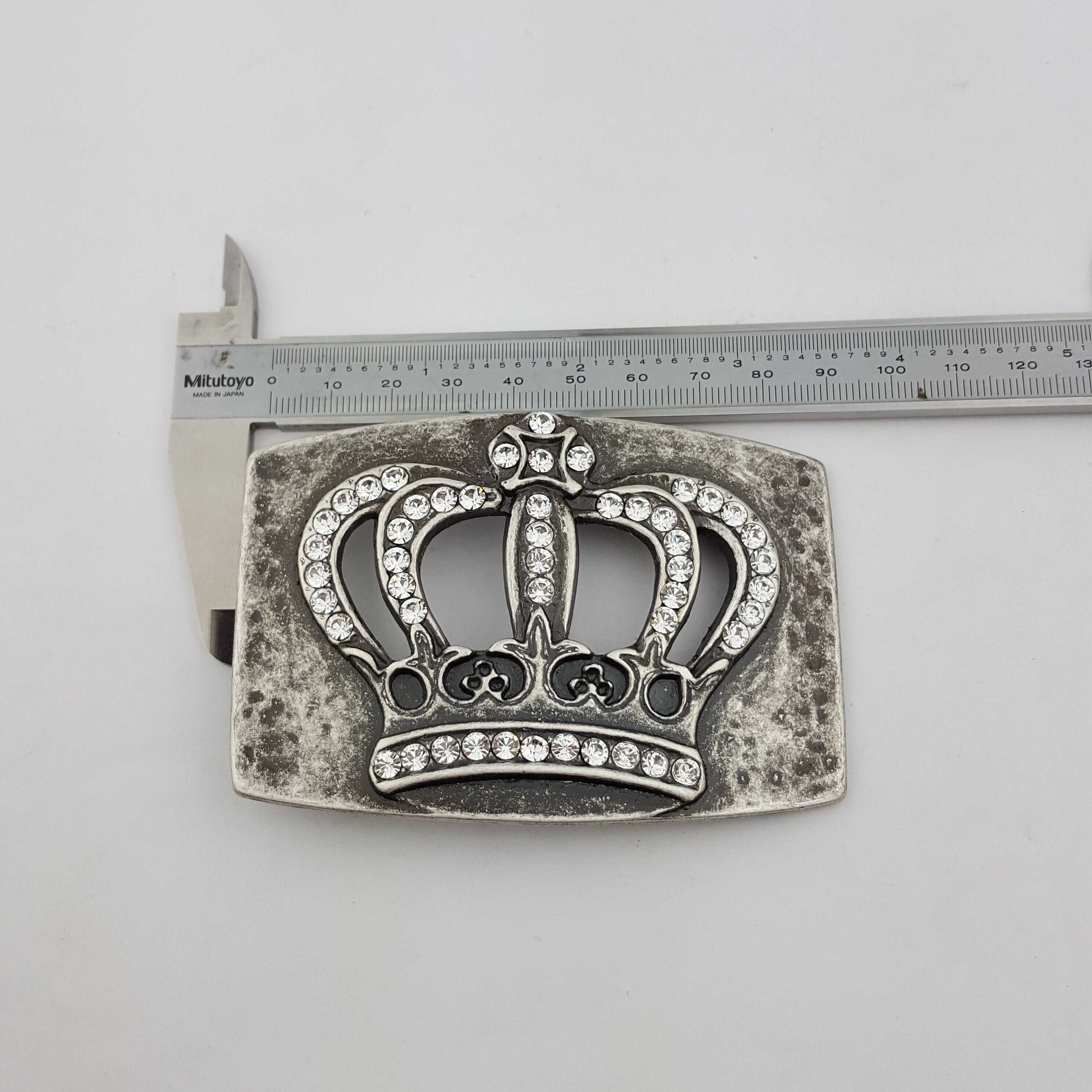 In Vintage Distressed Silver Finish, slight hammered effect Crown with real Clear Crystals Dimension is about 3.5″ by 2.4″ Fits belt strap with in 1.5″ or 40 mm