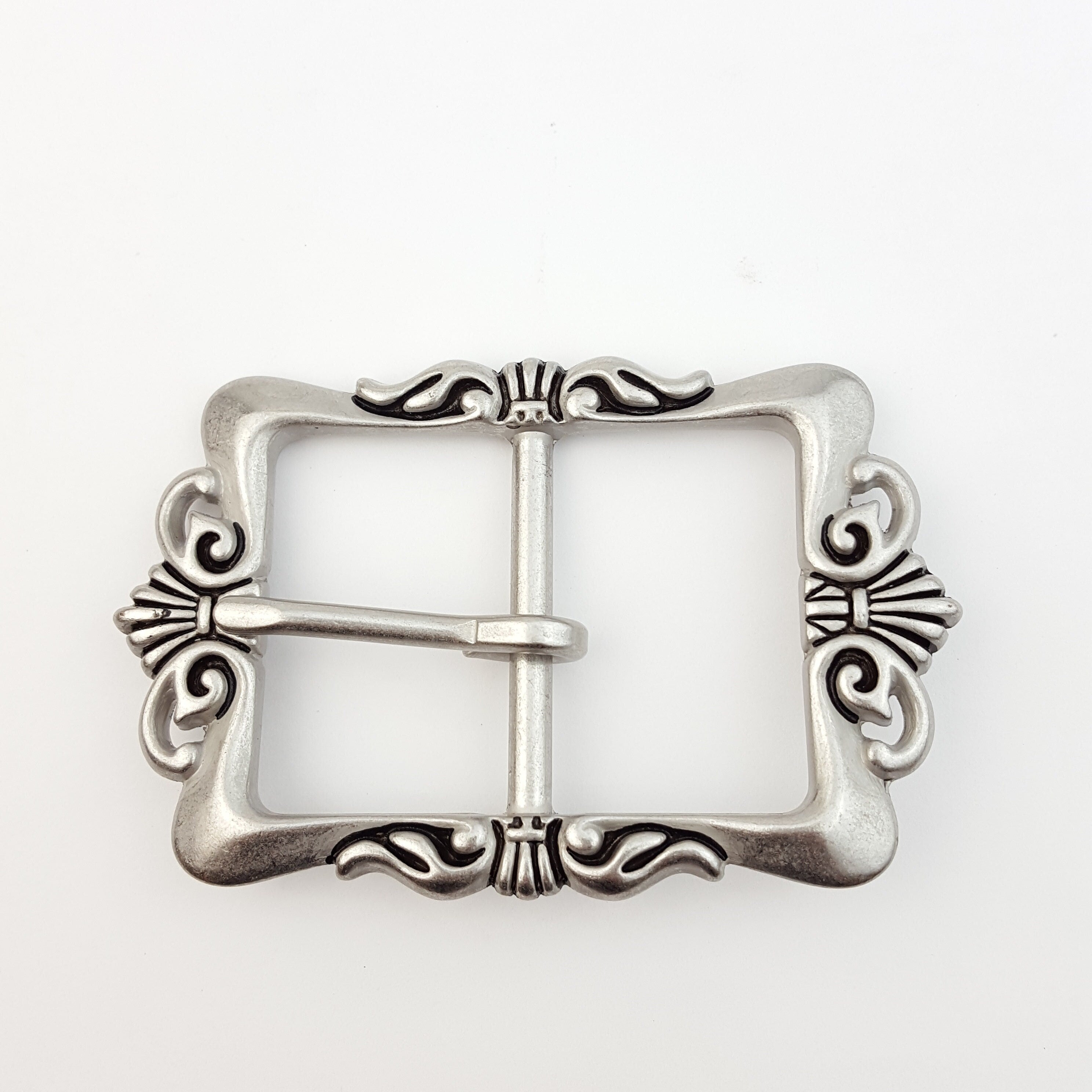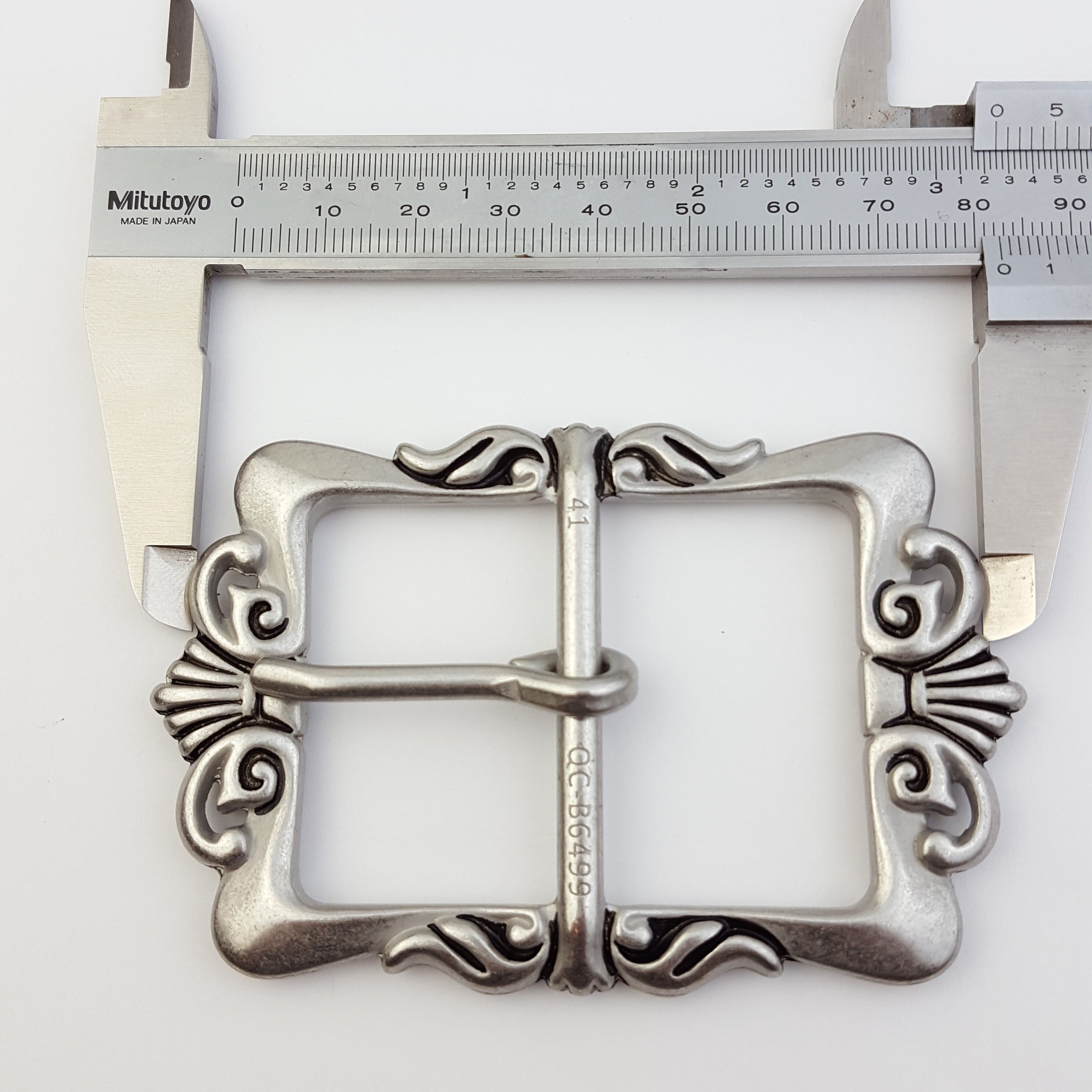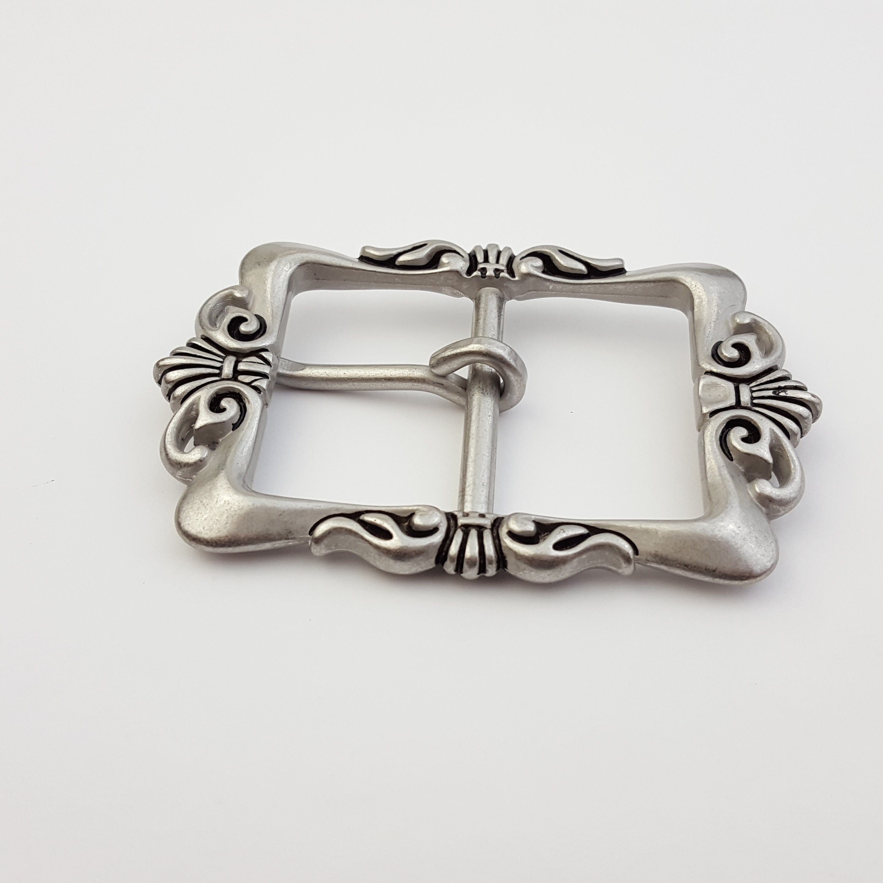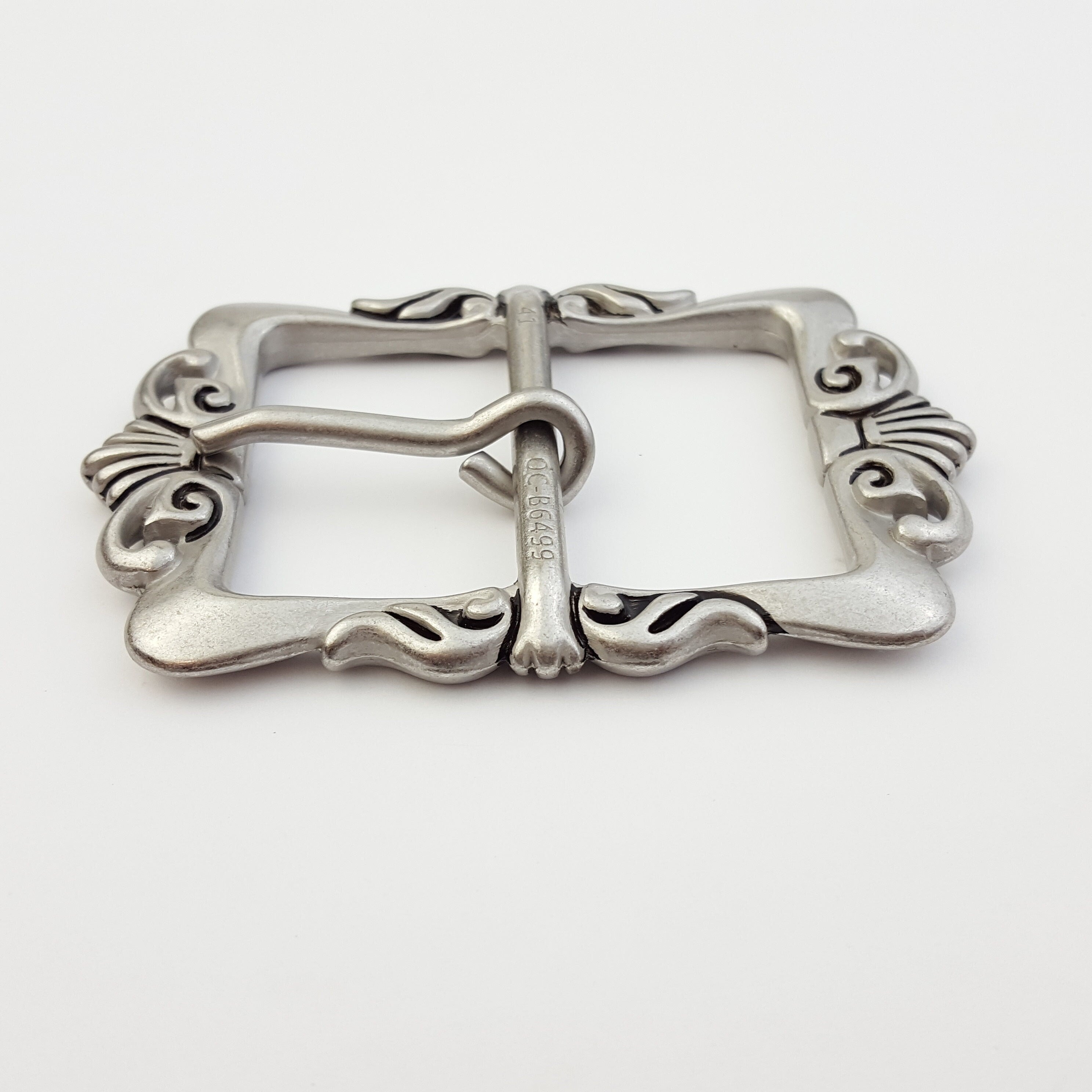 In a matte nickel silver plating finish Fit belt strap width 1.6″ (40 mm) or less Dimension of buckle: 3.5″ by 2.3″ Unisex Style Photo shown is on a 1.5″ width belt strap Price not include the strap