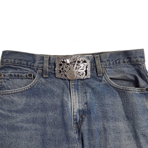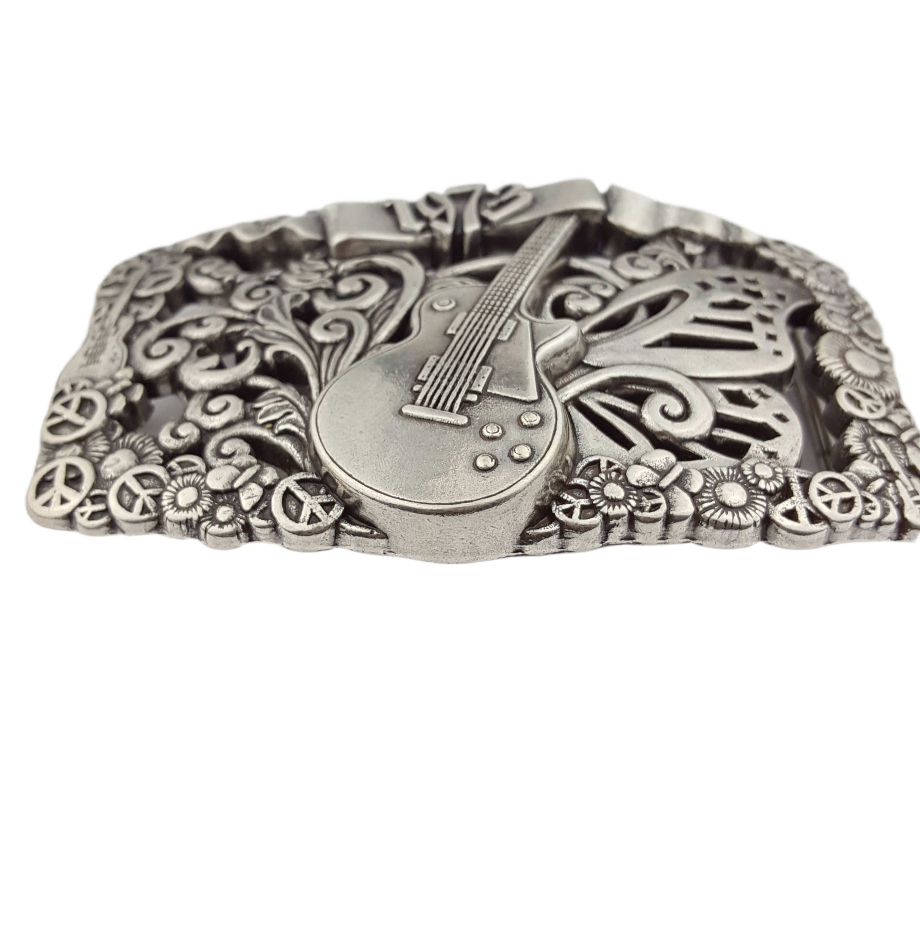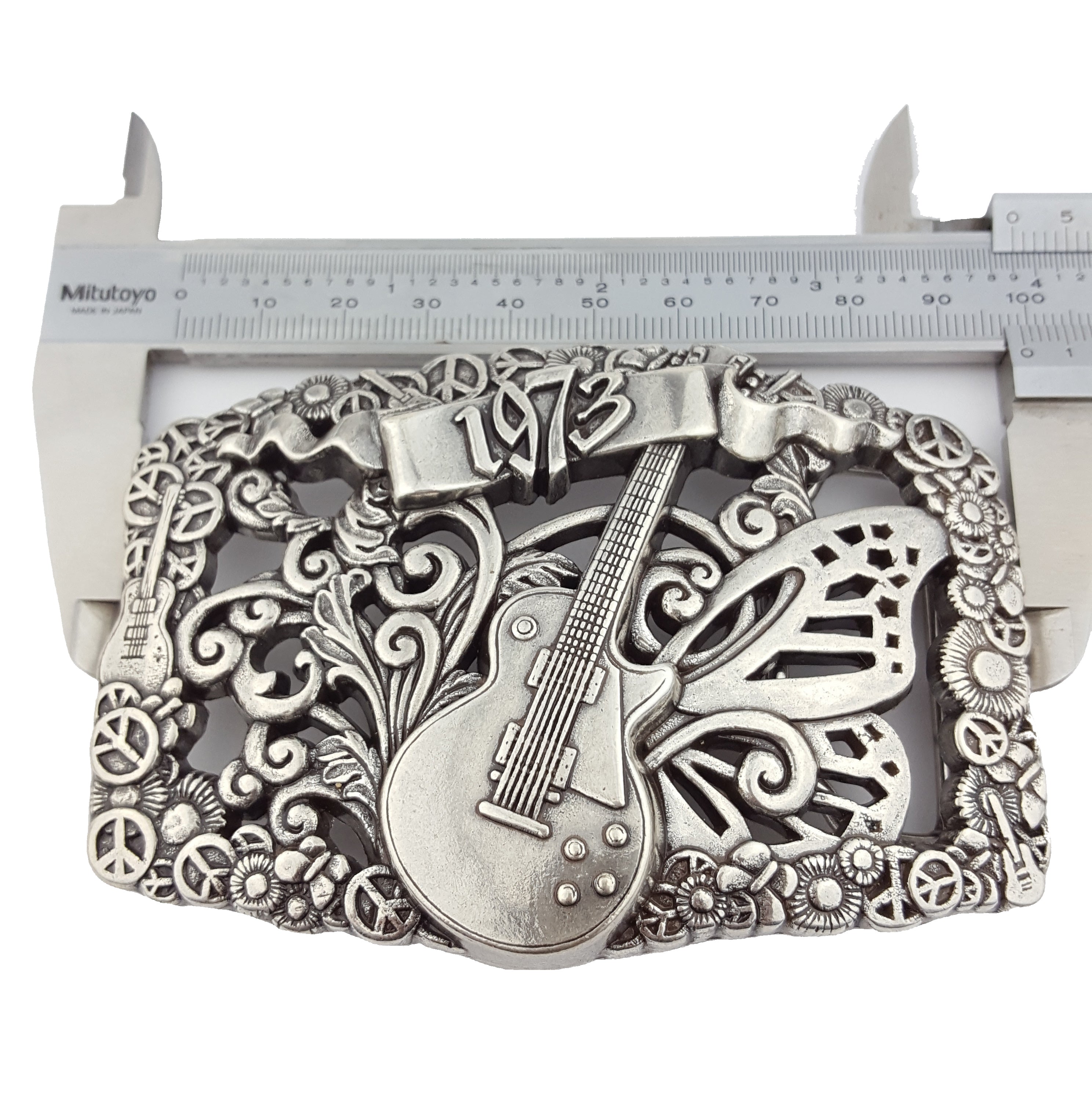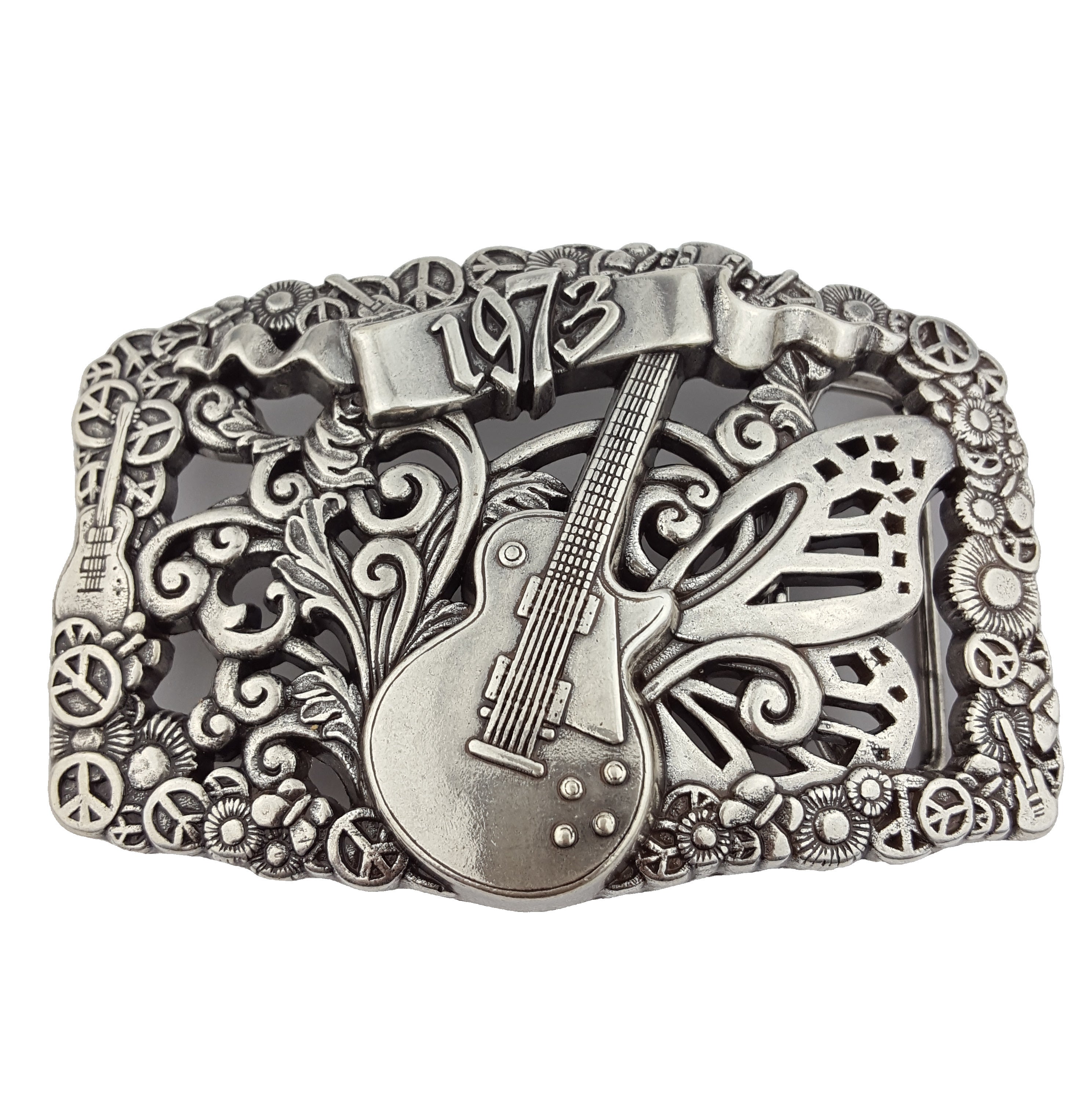 Buckle is designed with many details: Guitar in the center with a 1973 banner on top. A butterfly background and around the buckle rims are tiny peace signs, daisies and guitars. Dimension 3.9″ x 2.7″ weight 5 oz Swing bar at the back from belt strap will fit up to 1.75″ width or 45 mm