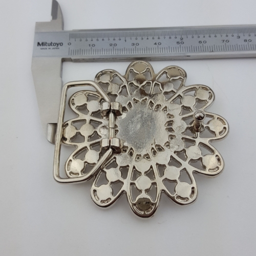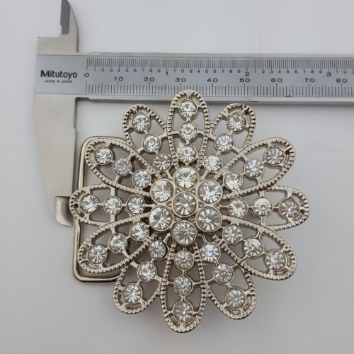 In shiny silver finishAll over real clear crystal decorated on the buckleDimension is about 2.75″ in diameterFits belt strap 1.5″ or lessfast shipping, usually same day ship out