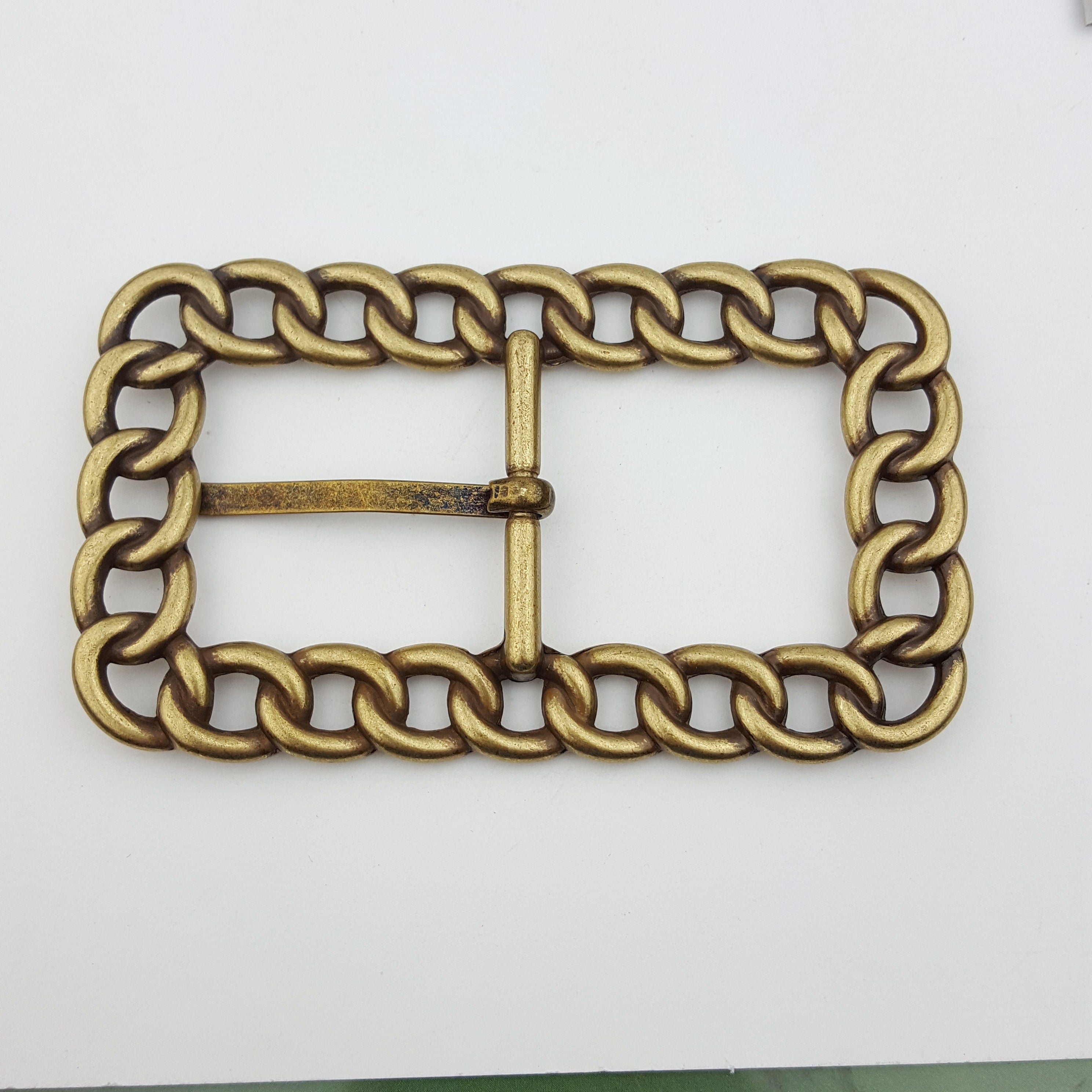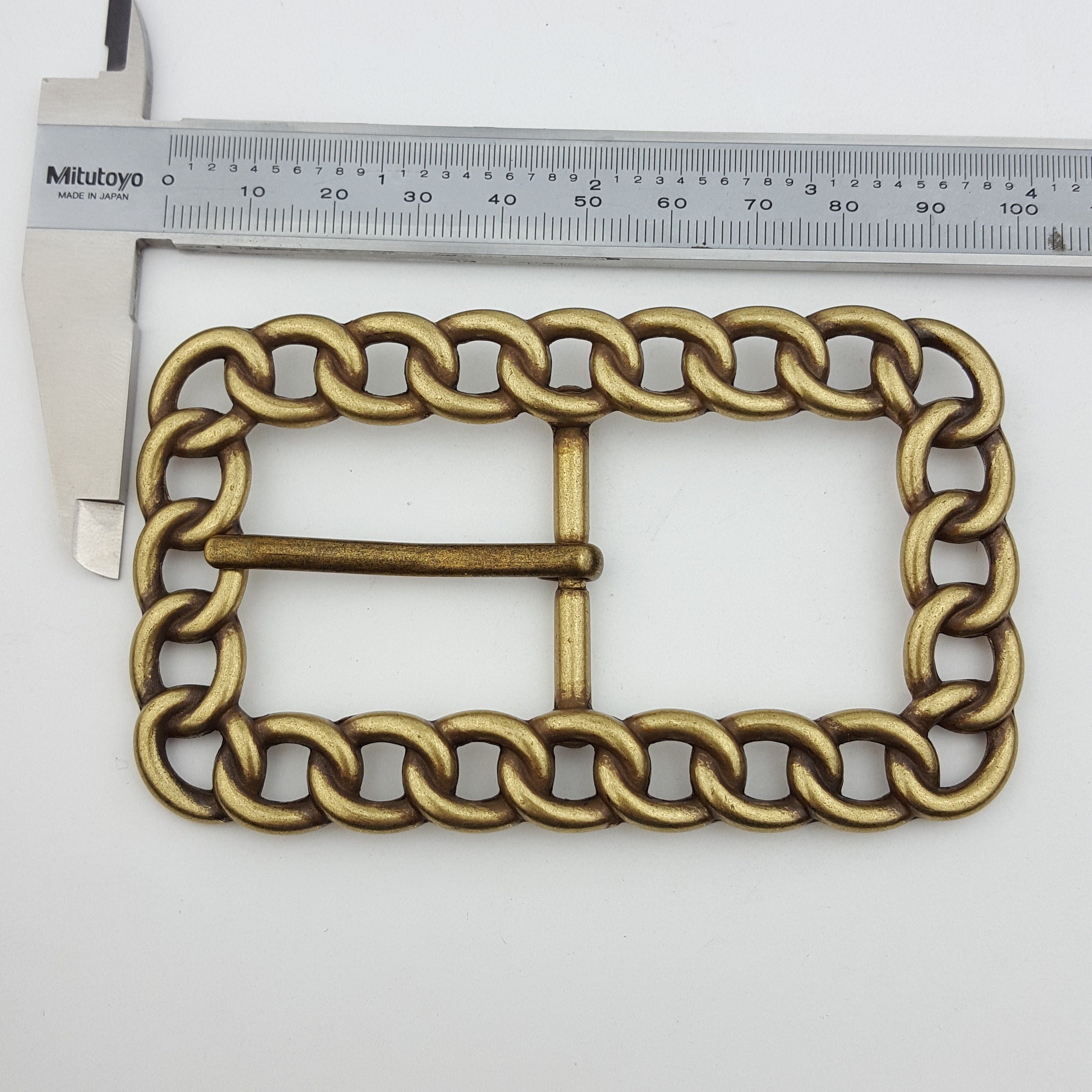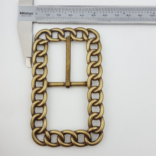 Made with Chain link design Fit belt strap width 1.25″ or less ( 32 mm) Buckle is about 3.9″ by 2.3″ outside dimension Finish is in antique brass plating finish