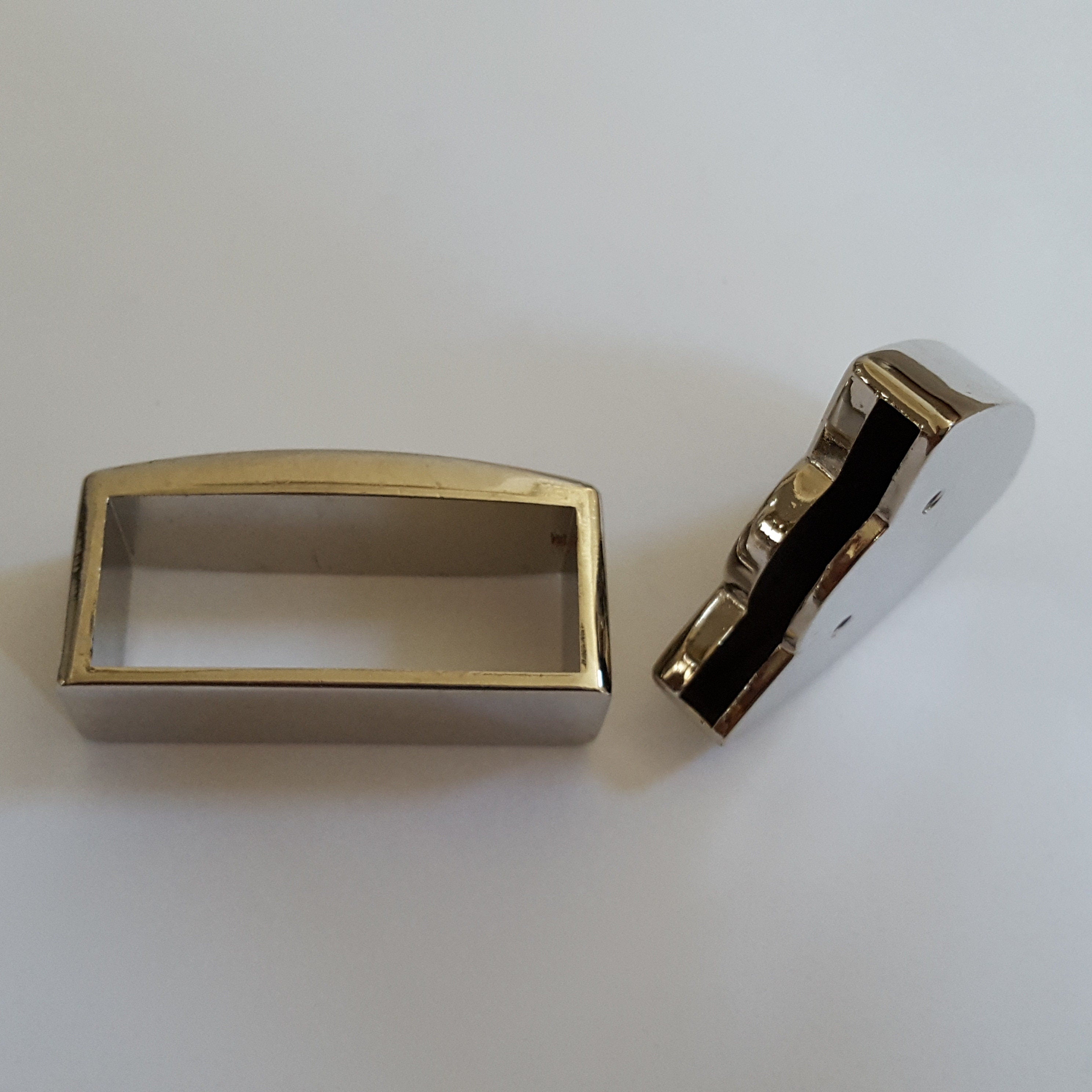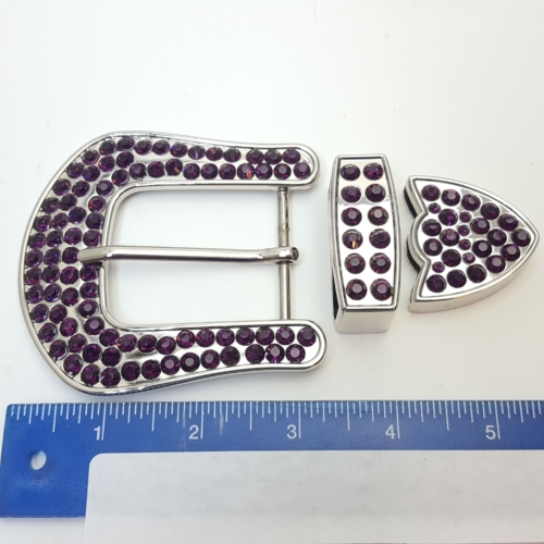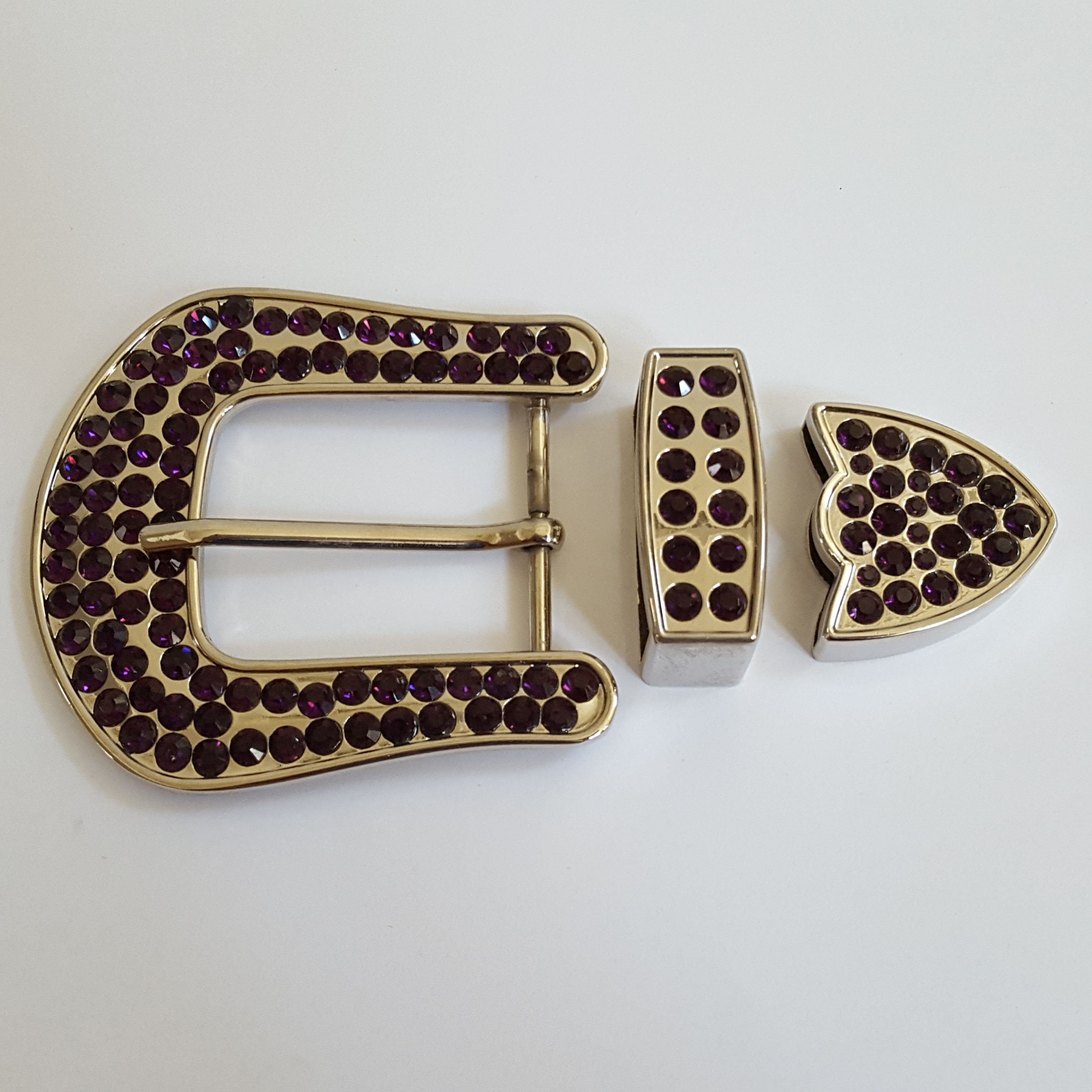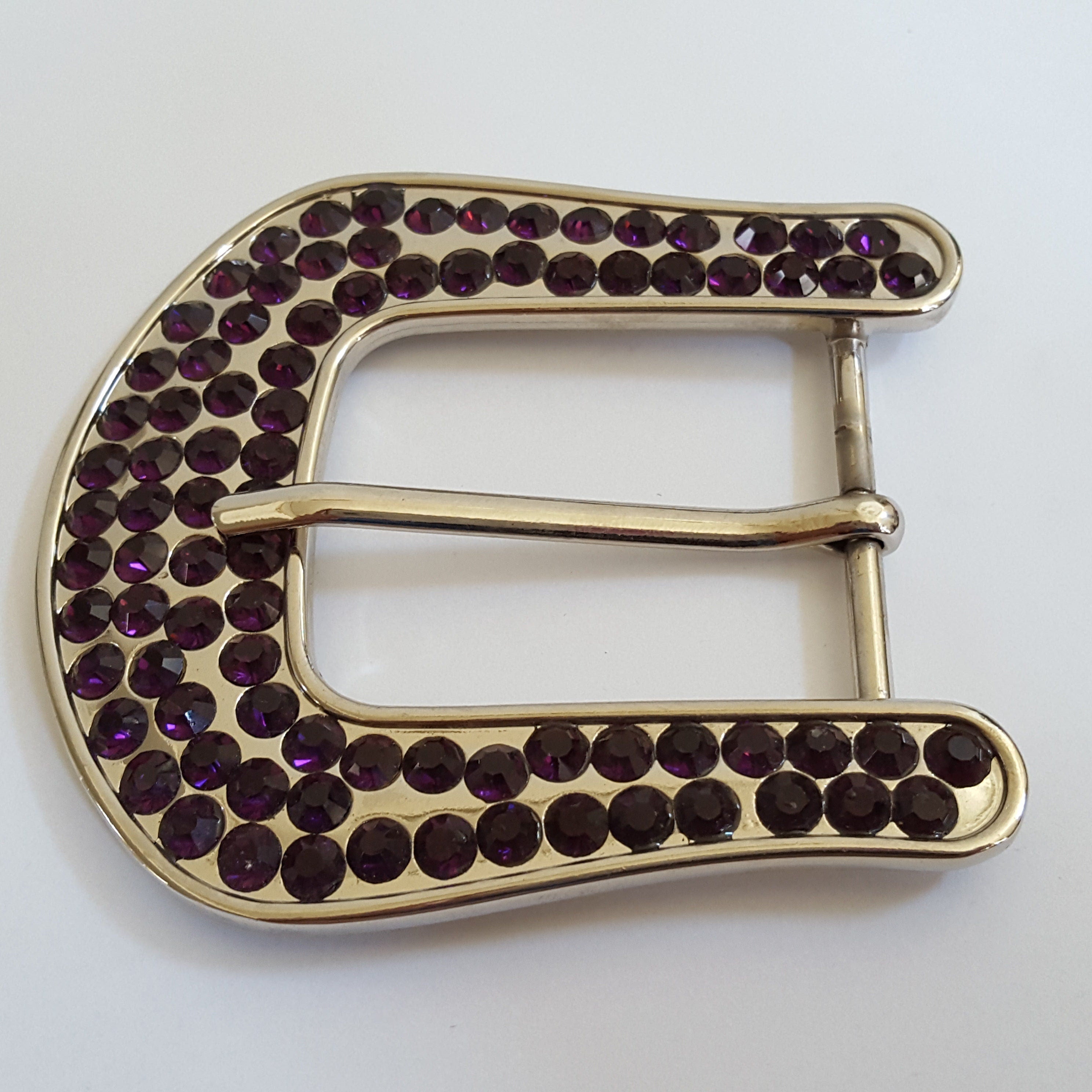 Buckle set in shiny silver with dark purple crystals Fits strap 1.5″ or 38 mm belt strap width Free shipping and usually ship out the same business day