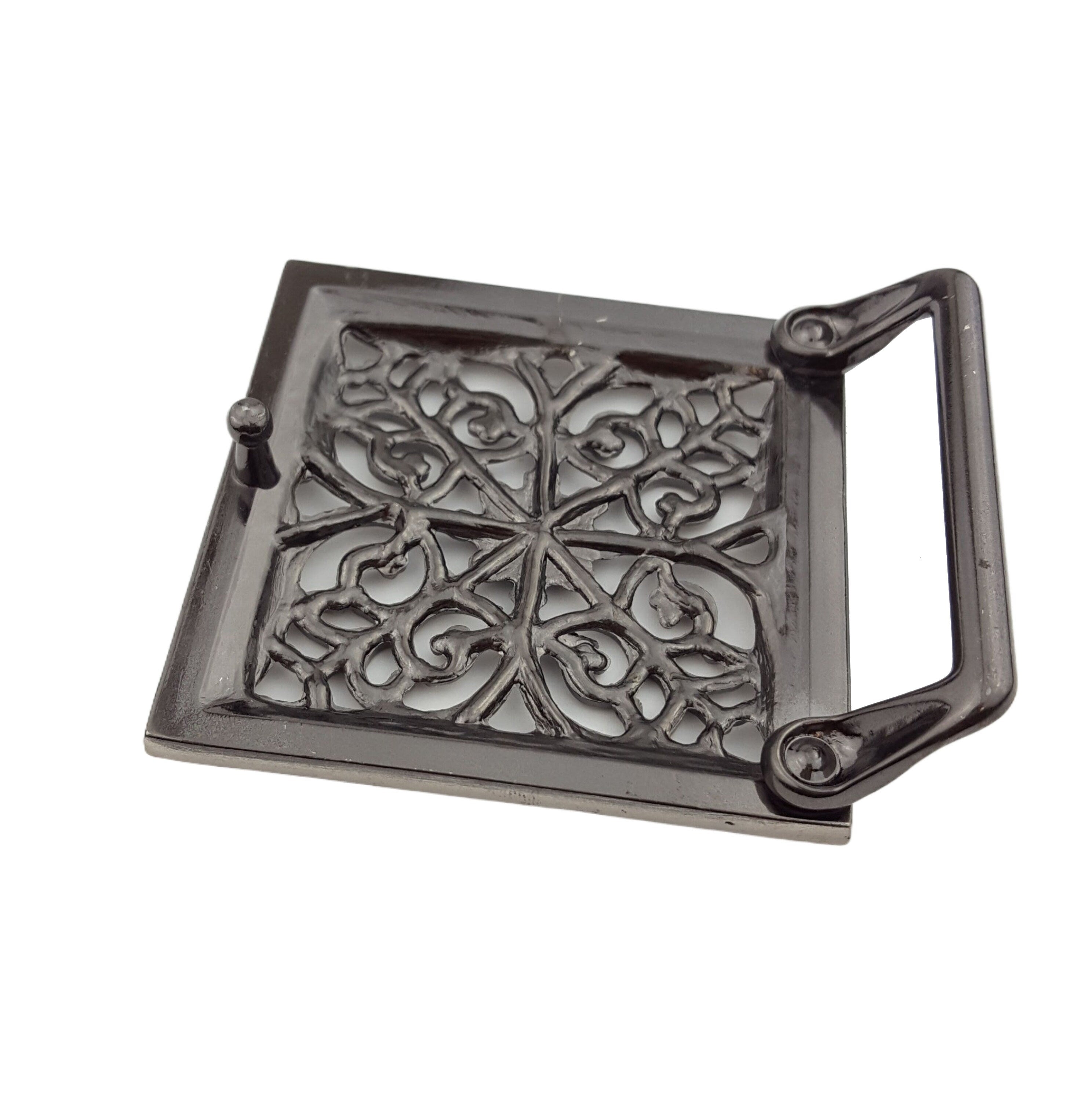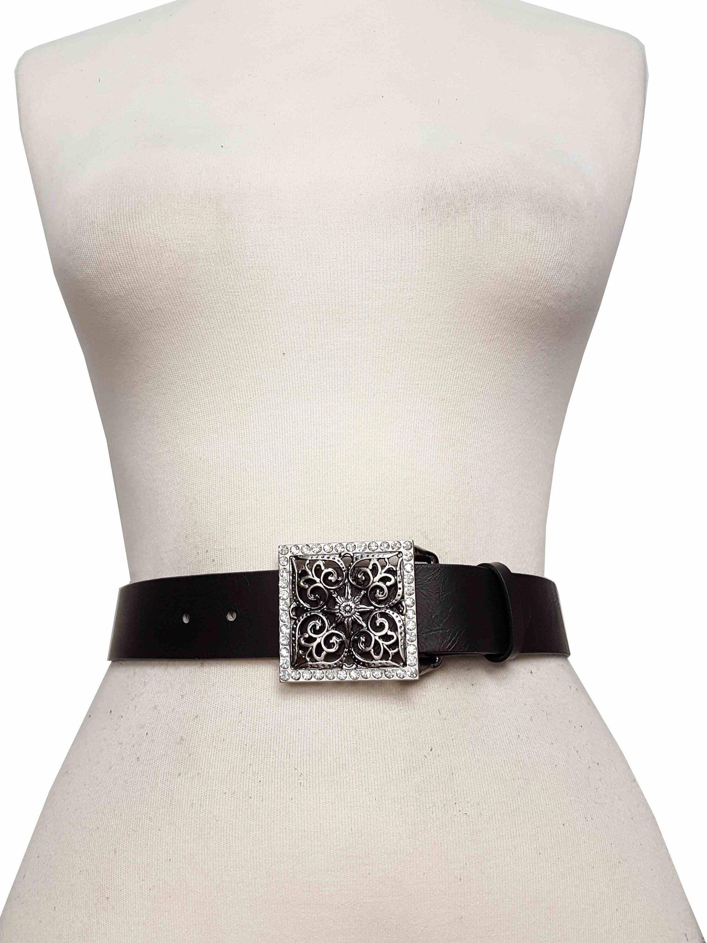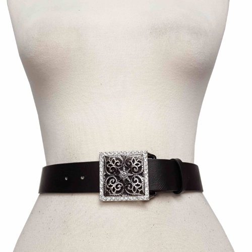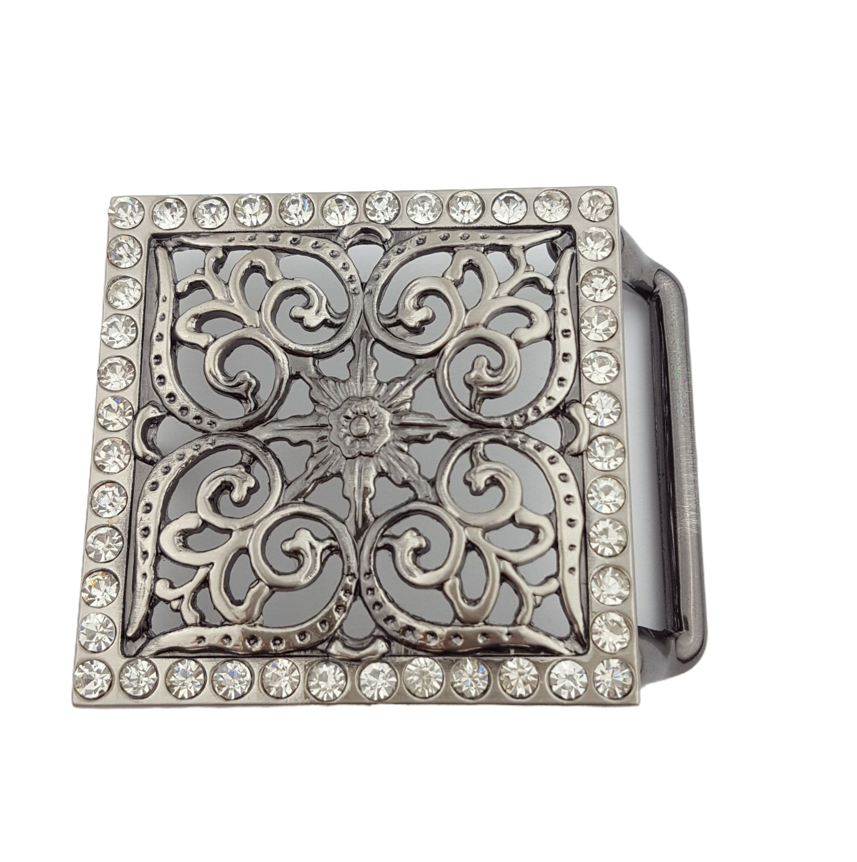 In a brushed silver plating finish Square shape with dimension 2.3″ x 2.3″ Will fit strap up to 1.55″ width or 40 mm Clear crystal around the rim of the the buckle photo is on a 1.5″ width black strap. Price not including belt strap