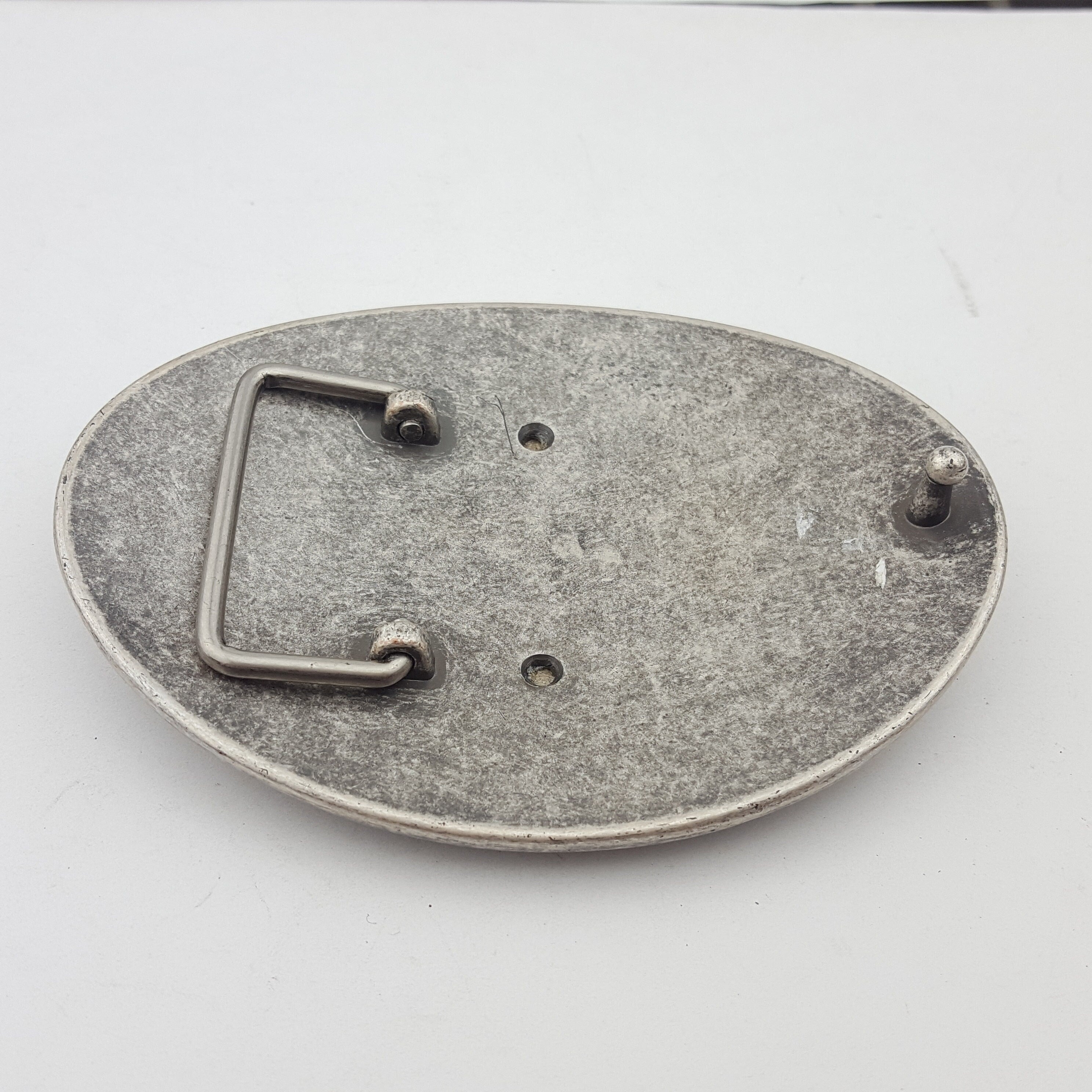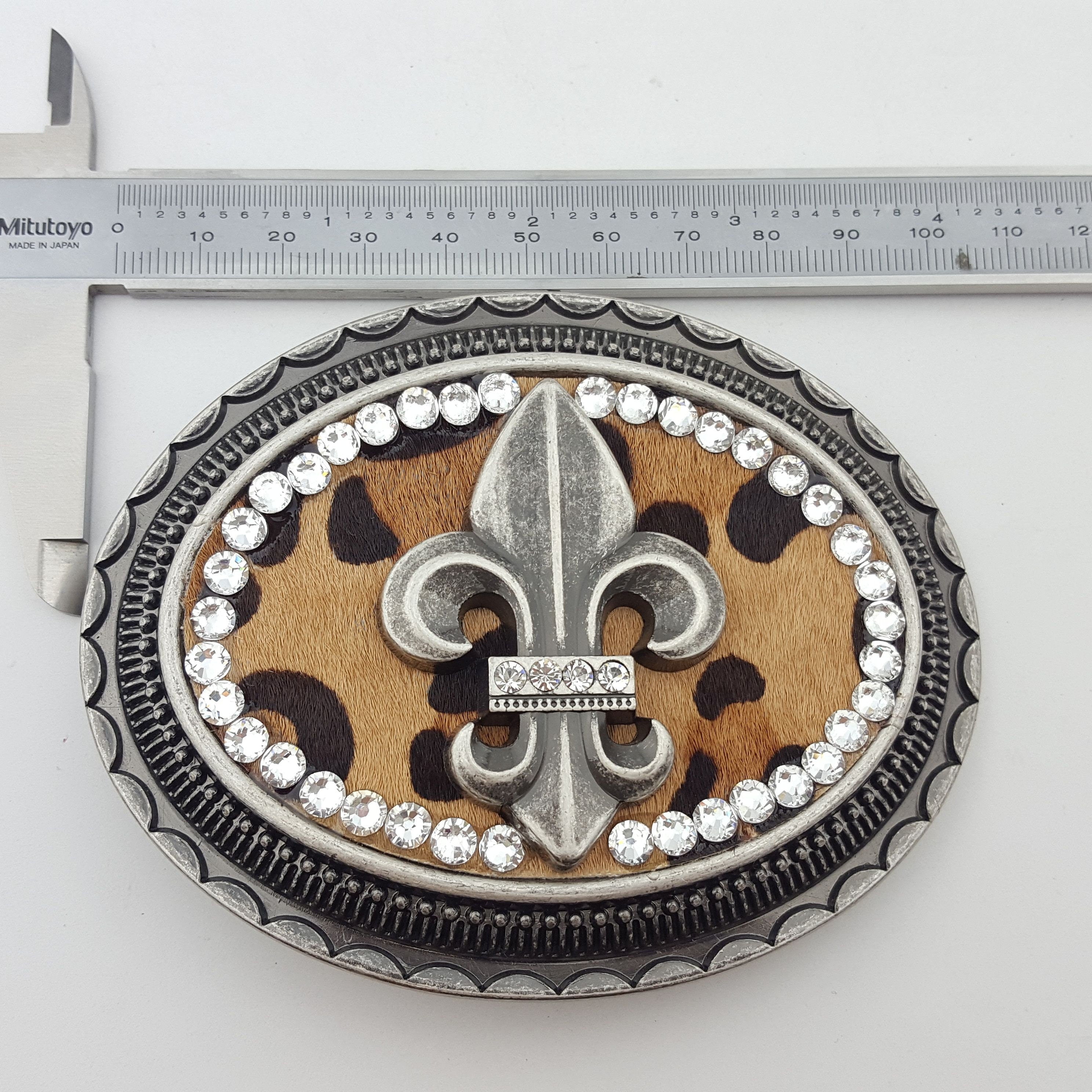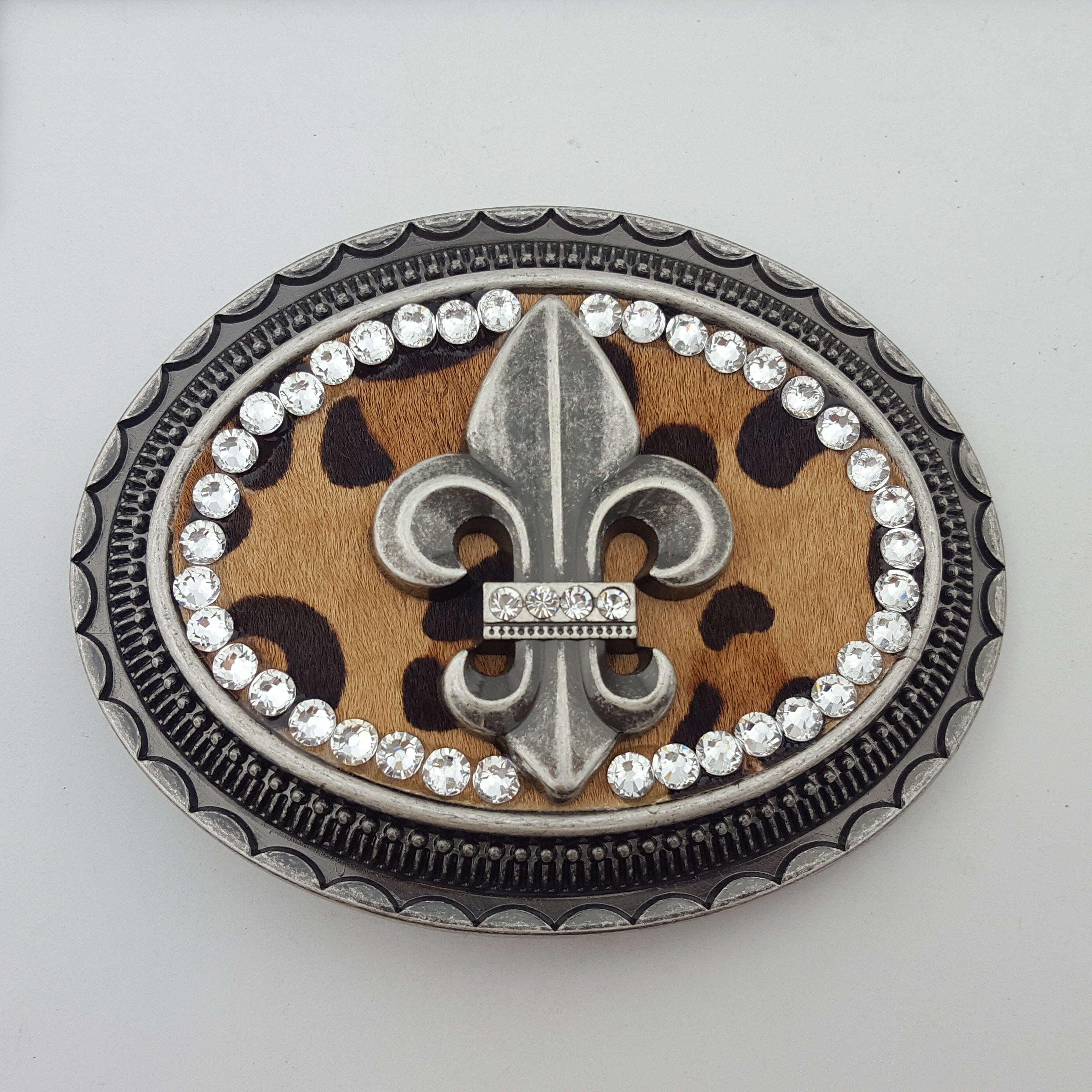 Buckle in Vintage Antique Silver Finish Decorated with a Fleur de lis and crystal around the rim Inlay is a real hair on calf leopard print leather Dimension is about 4″ by 3″ Fits belt strap 1.5″ (38 mm) or less