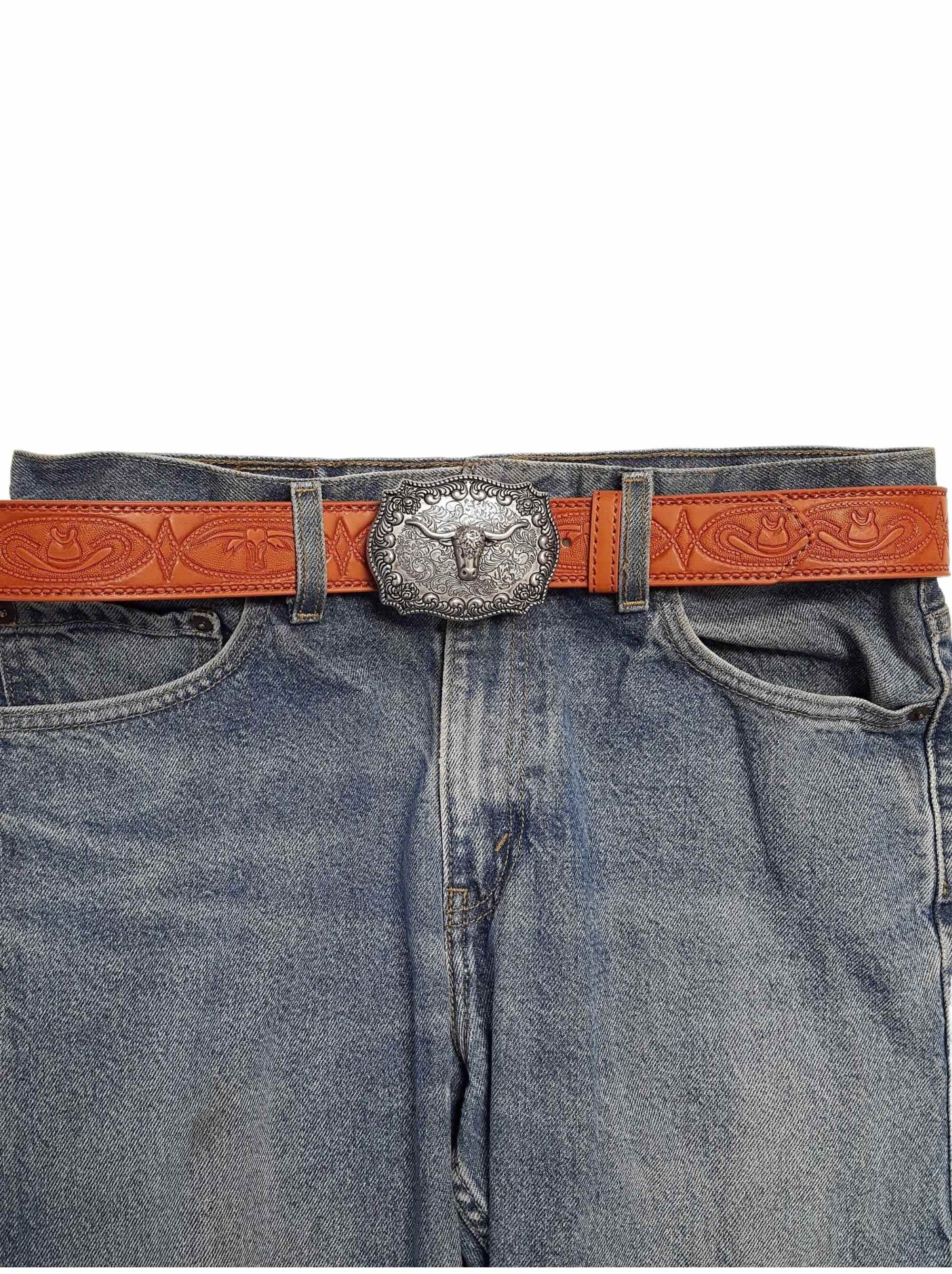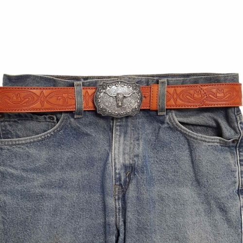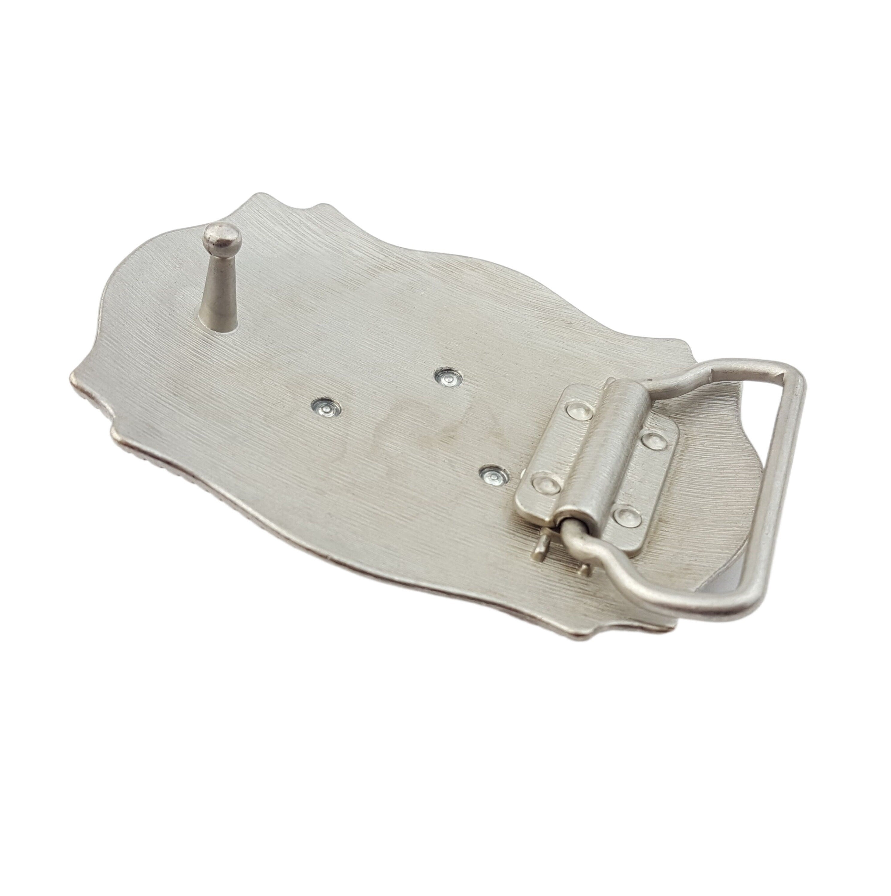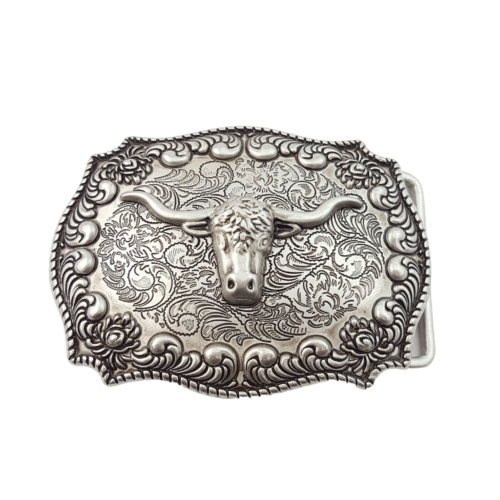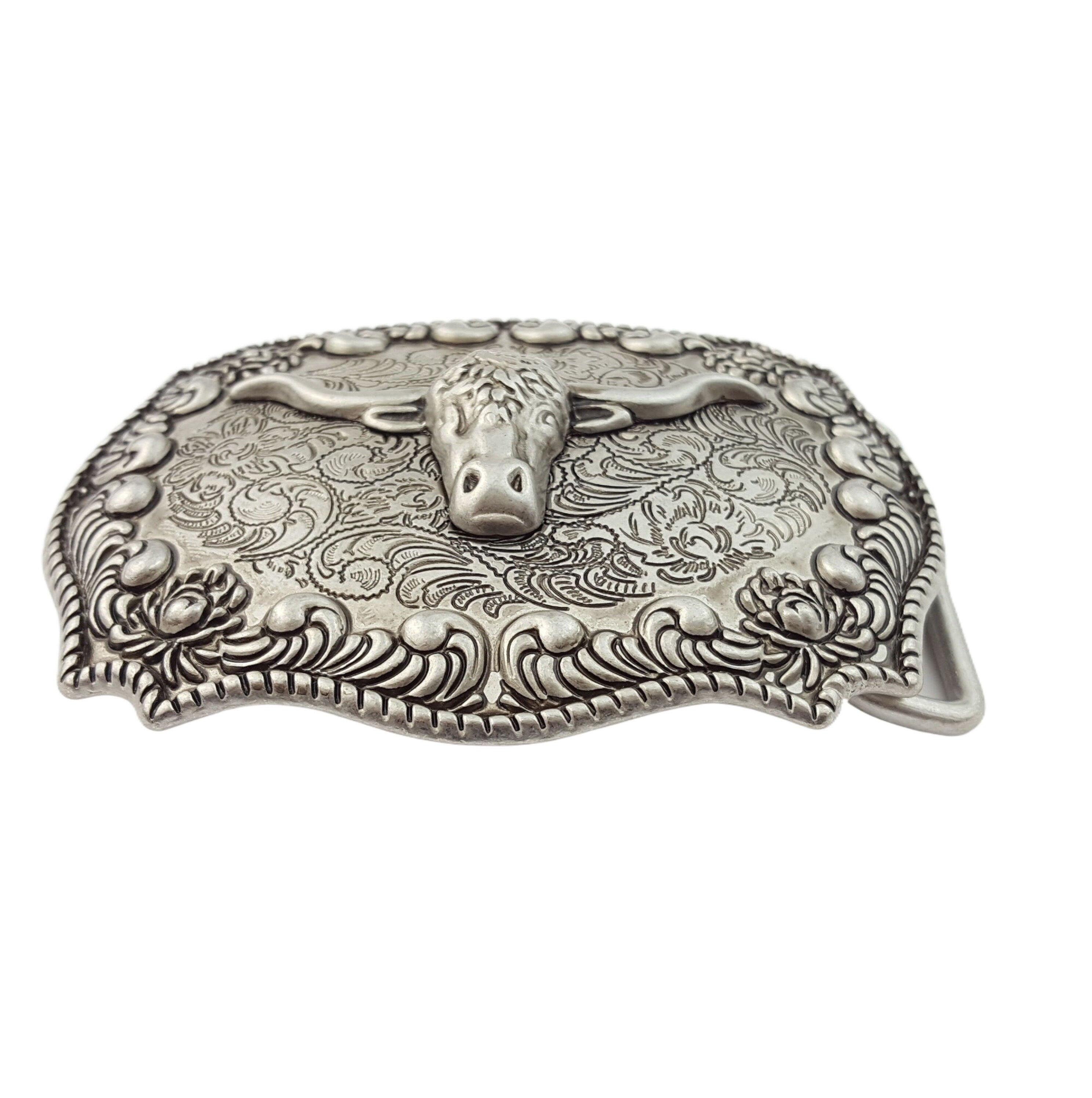 In Dark Antique Nickel plating finish Detailed with rope edge rim, and Long Horn at front of buckle Fits strap 1.5″ or 38 mm Outside Dimension of the buckle is 3.3″ by 2.4″ Last photo shown on a 1.5″ width belt strap. Belt is not included