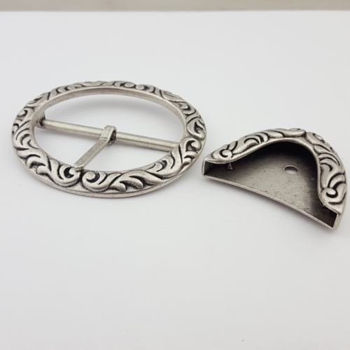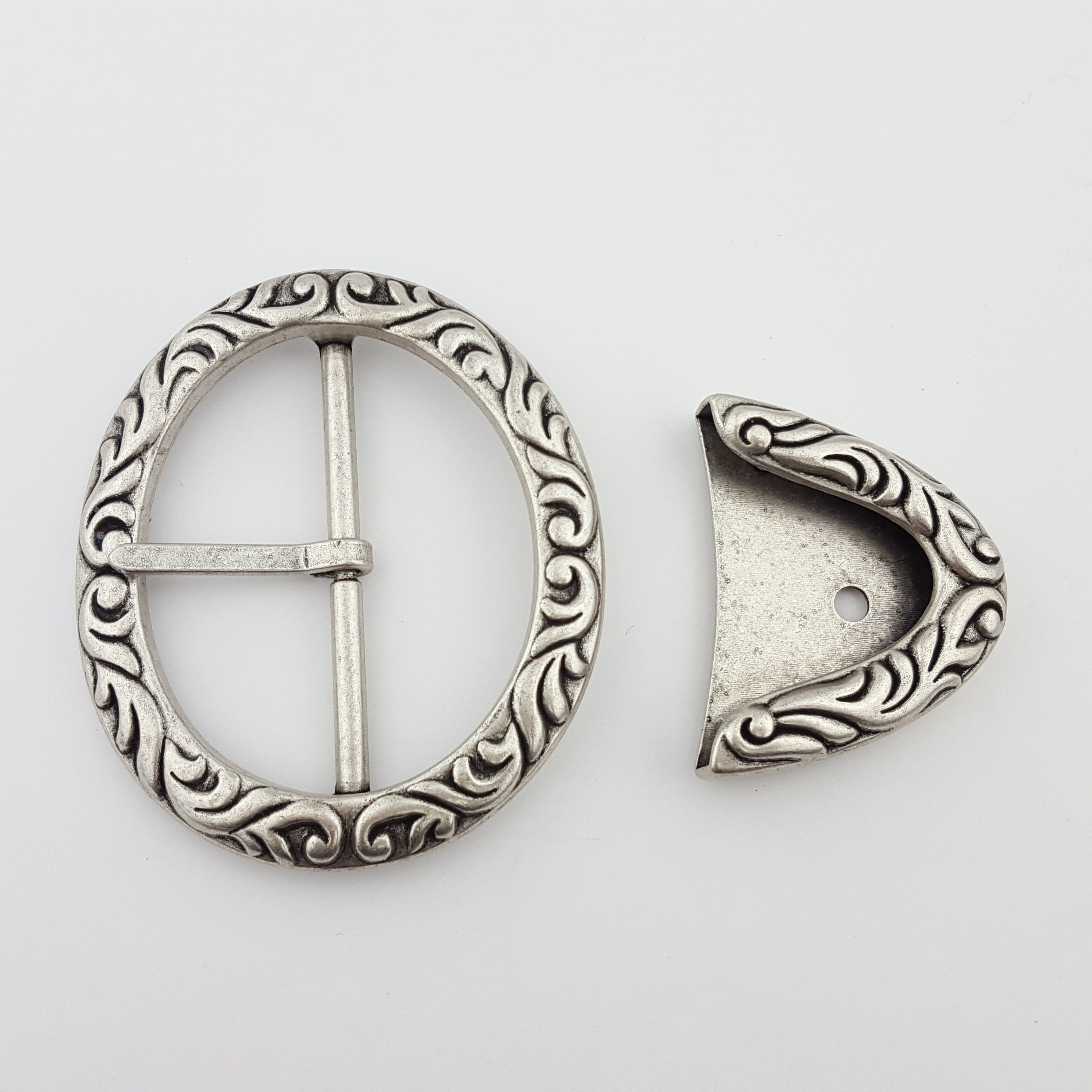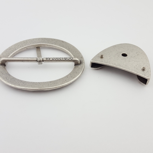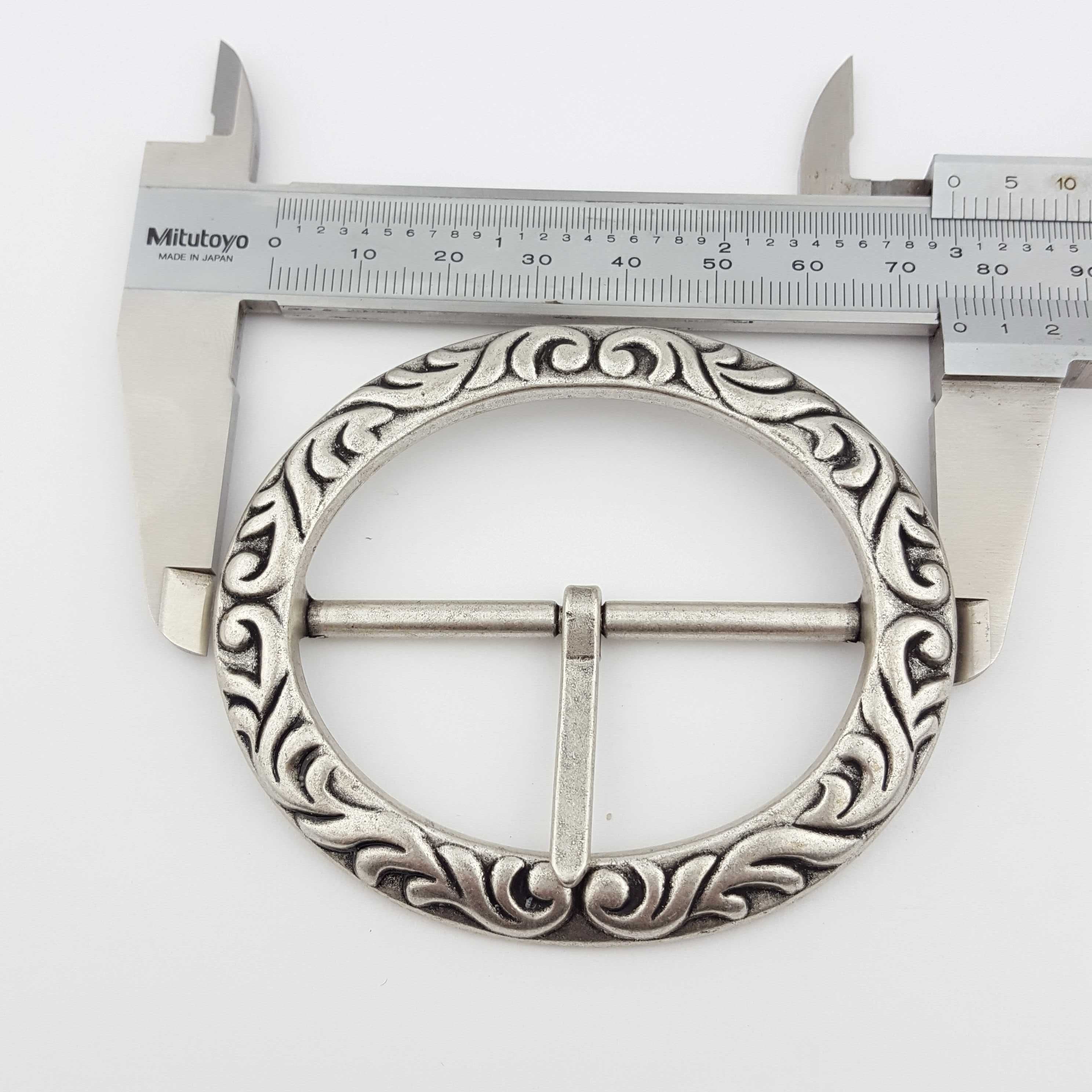 Buckle in an oval shape. Dimension of buckle is 2.6″ x 3″ Tip dimension is 1.9″ x 1.55″ Ideally fits belt width of 2.25″ or 57 mm Buckle and tip in a matte silver metal plating finish. Last photo shown on a 1.9″ or 50 mm width strap. Strap photo for reference only, price is for buckle set only.
