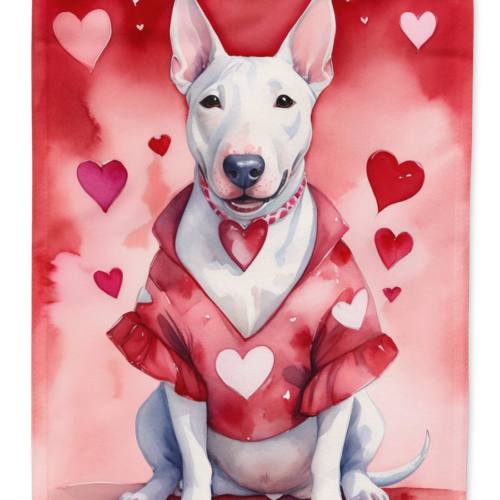 House Flag featuring breed specific Bull Terrier artwork. Celebrate Valentine’s Day with this Valentine’s Day Large Flag. Presenting our Heavy Duty Polyester House Size Decorative Sleeve Pole Flag, a vibrant addition to enhance the aesthetic appeal of your home. This large decorative flag, measuring approximately 28 x 40 inches, offers ample coverage and visibility. Each flag is meticulously sewn and made individually, ensuring a unique piece that may slightly vary in size. It’s a sleeve pole flag, designed to fit a standard decorative flag pole effortlessly. Please note that the flag pole and bracket are not included and should be purchased separately. What sets our flag apart is its dual-sided print. The design is mirrored on both sides of the fabric, allowing for uniform visibility regardless of the angle. Printed in full color, our flag showcases vibrant hues that truly stand out. To ensure lasting vibrancy and durability, the dyes are heat-set into the fabric. This ensures your flag remains bright and captivating through various weather conditions. Elevate the look of your home with our Heavy Duty Polyester House Size Decorative Sleeve Pole Flag!