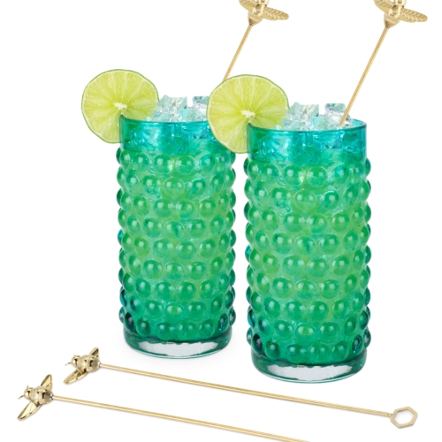 Accent sumptuous beverages with understated elegance brought to dazzling reality through this collection of bee stir sticks. Golden plating sheaths durable stainless steel, creating a buzzworthy effect. Set of 4 Crafted from stainless steel and zinc alloy Gold plated finish 8.75 inches Perfect for indoor or outdoor parties