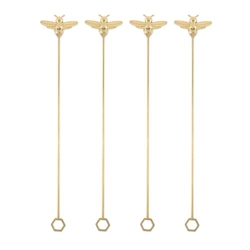 Accent sumptuous beverages with understated elegance brought to dazzling reality through this collection of bee stir sticks. Golden plating sheaths durable stainless steel, creating a buzzworthy effect. Set of 4 Crafted from stainless steel and zinc alloy Gold plated finish 8.75 inches Perfect for indoor or outdoor parties