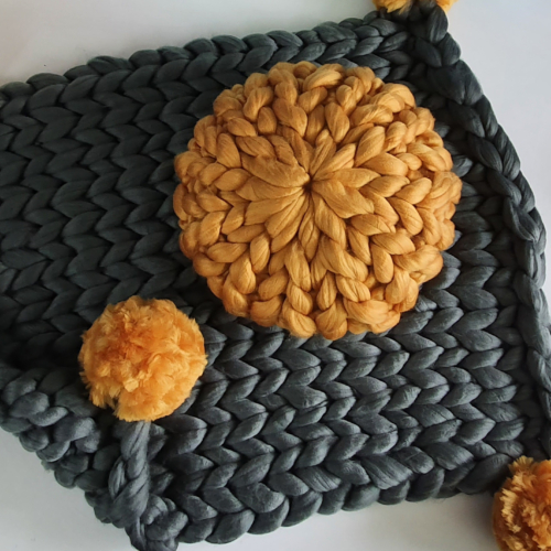 Learn to hand knit a lap blanket with pom poms using giant yarn.