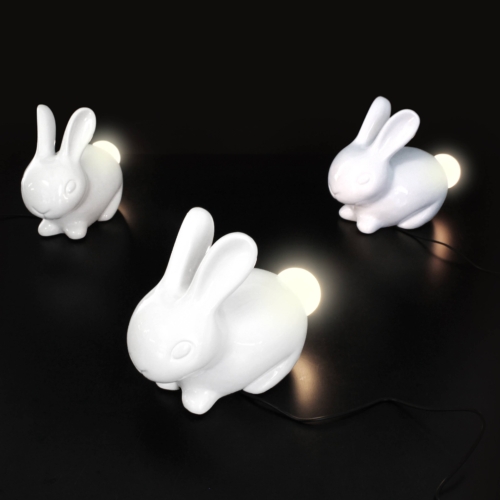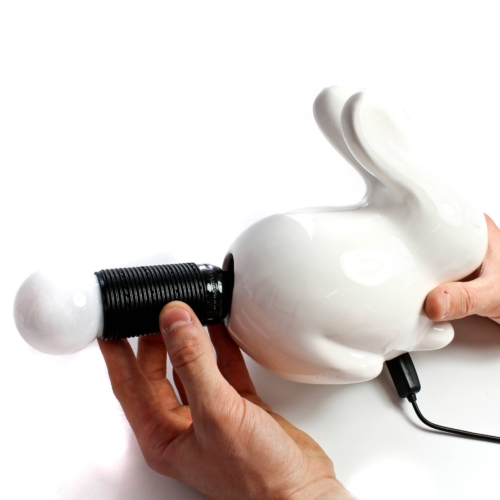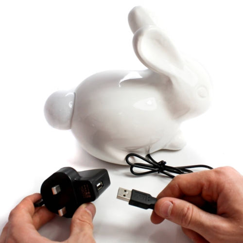 White porcelain rabbit shaped light with LED light up tail.An adorable bedside nightlight that emits a fresh white glow to brighten any room!Powered USB (5V adapter included) self-sufficient, portable light which can be displayed on a bedside table, shelf, desk, or as a nightlight in bedrooms/nursery.A cute decorative ornament for your home, party or window display and a great present.A durable lighting product with charging cable accessories included.