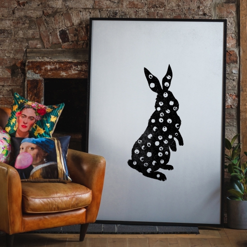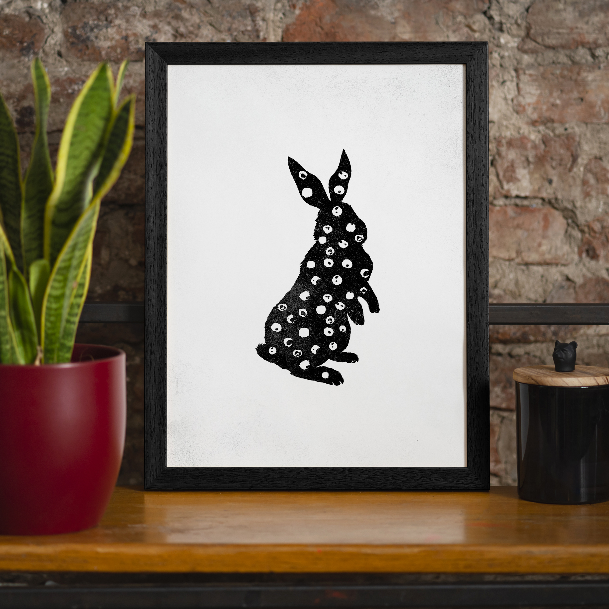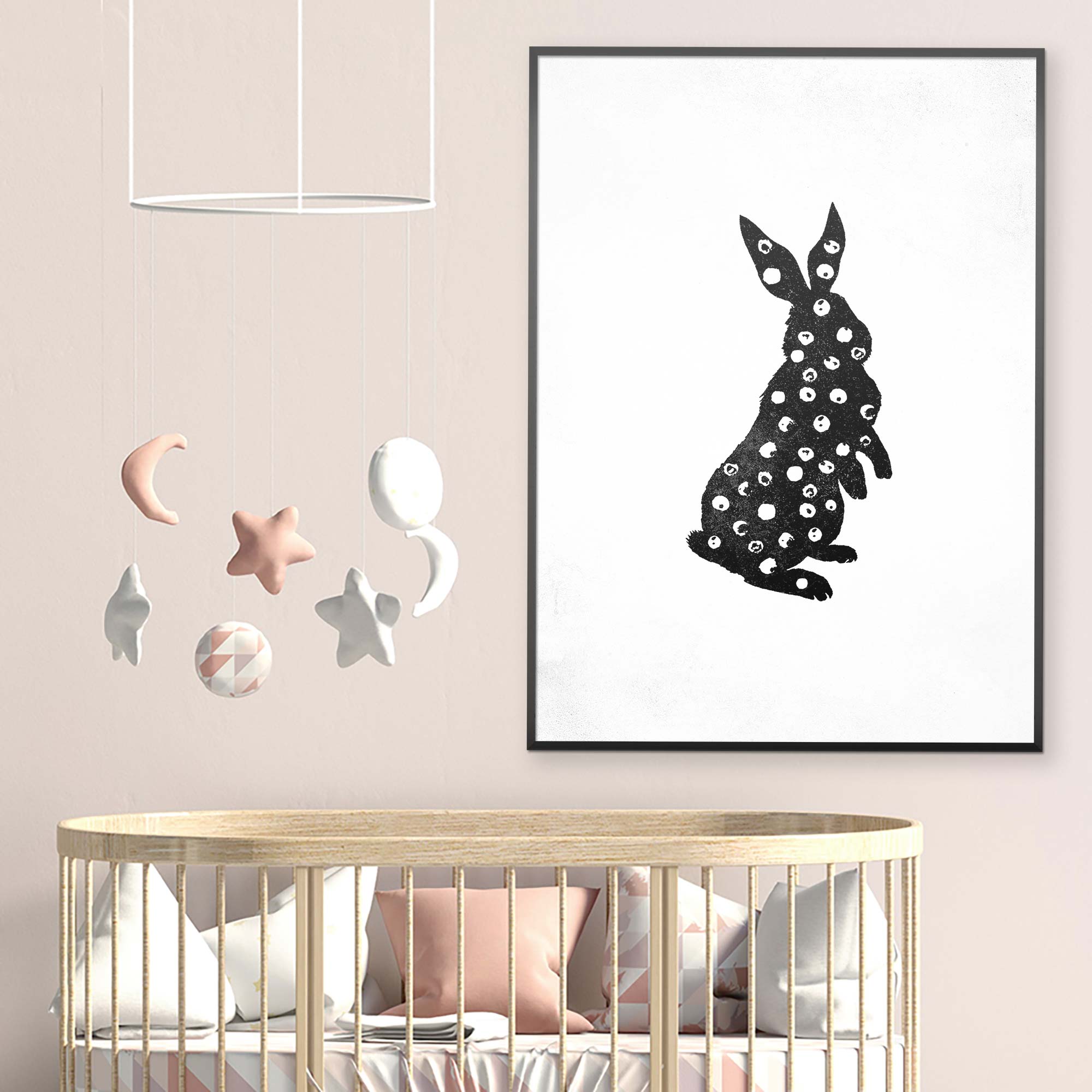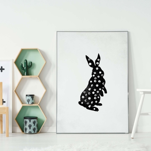 Simple, elegant silhouette of a bunny rabbit in a vintage retro print style. Filled with hand drawn polkadot shapes. These prints are great educational tools as your child’s can try to name the objects and animals from the silhouette.