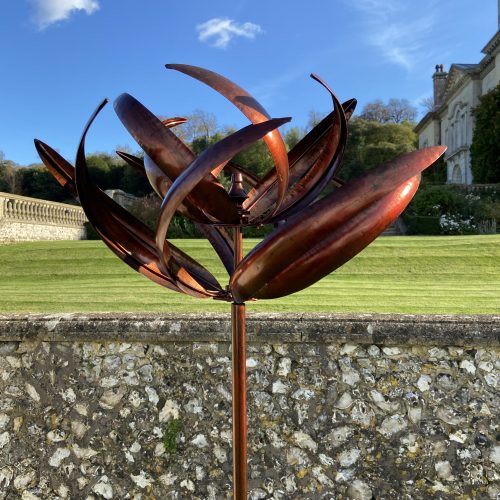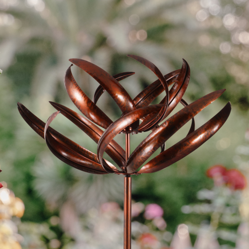 This beautiful wind spinner sculpture standing at 2.08m tall will provide a real statement piece in your garden with its two tone bronze & black colour. Not only is it an eye catching addition as its two sails gently turn in the breeze to provide movement to your garden but it is strong & sturdy with its powder coated finish to keep it from weathering & making the wind sculpture resistant to scratching. This statement piece outdoor wind sculpture includes a strong ground stake so that it will be securely fixed into the ground whether windy or raining. It is the perfect addition to any garden.