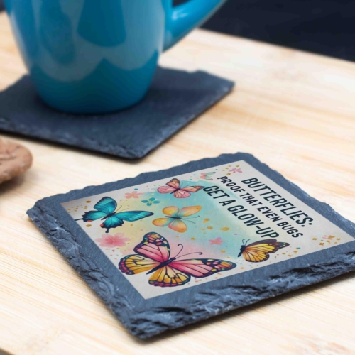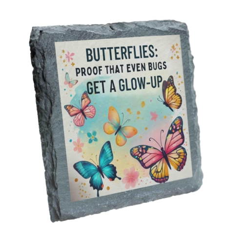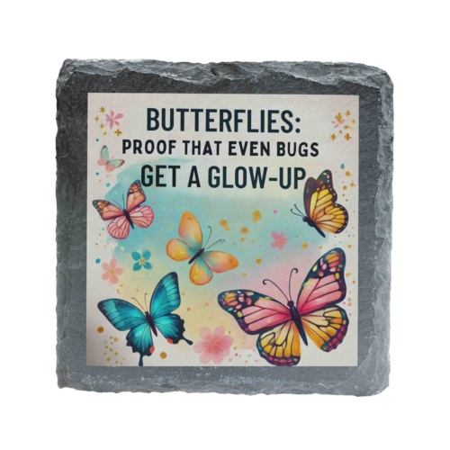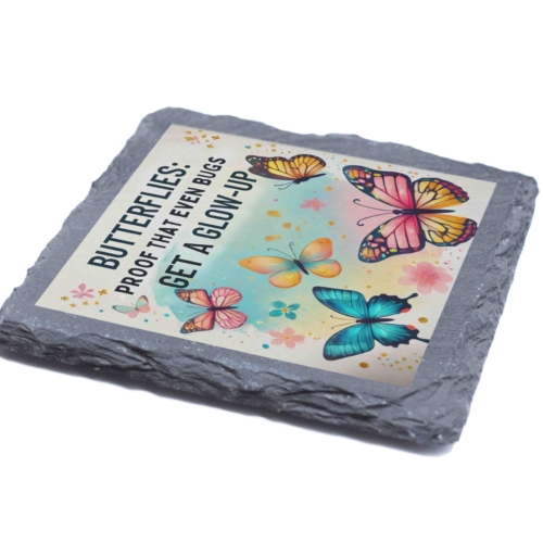 Bring inspiration to your space with this beautifully crafted slate coaster featuring a vibrant butterfly design and the empowering message: “Butterflies: Proof That Even Bugs Get A Glow-Up.” The colorful artwork celebrates transformation and beauty, making it a delightful addition to any decor. Crafted from natural slate, this coaster combines durability with elegance. Its felt backing ensures your surfaces are protected while the unique textured edges add a rustic charm. Ideal as a motivational gift, desk accessory, or coffee table decor, this coaster is perfect for anyone who loves butterflies or appreciates a reminder of life’s glow-up moments. Charming Design: Features colorful butterflies with the uplifting quote: “Butterflies: Proof That Even Bugs Get A Glow-Up.” Durable Slate Material: Made from high-quality natural slate with a unique textured edge for a stylish look. Protective Backing: Non-slip pads on the bottom ensure stability and prevent scratches on your furniture. Versatile Home Decor: Perfect for living rooms, offices, or as a motivational gift for friends and family. Gift-Ready Packaging: Comes in a sleek, eco-friendly box, ready to inspire and delight.