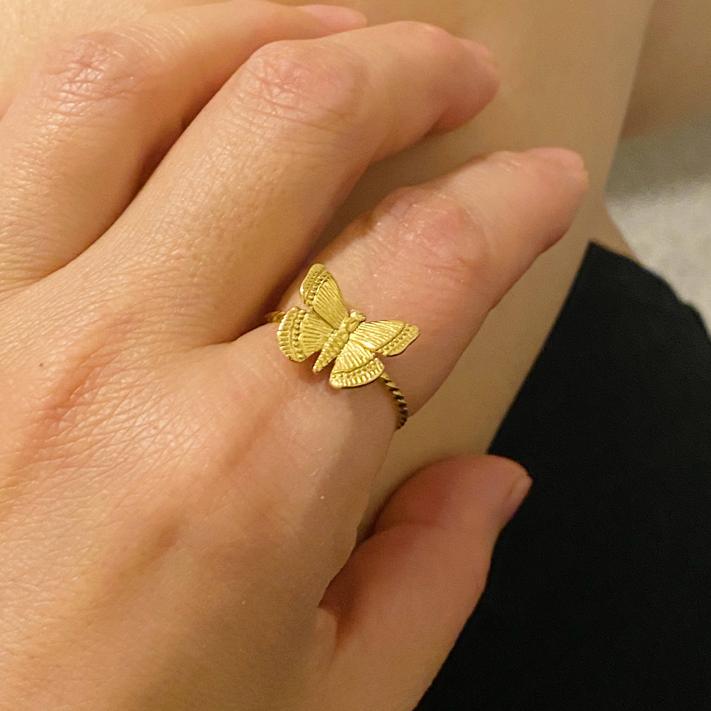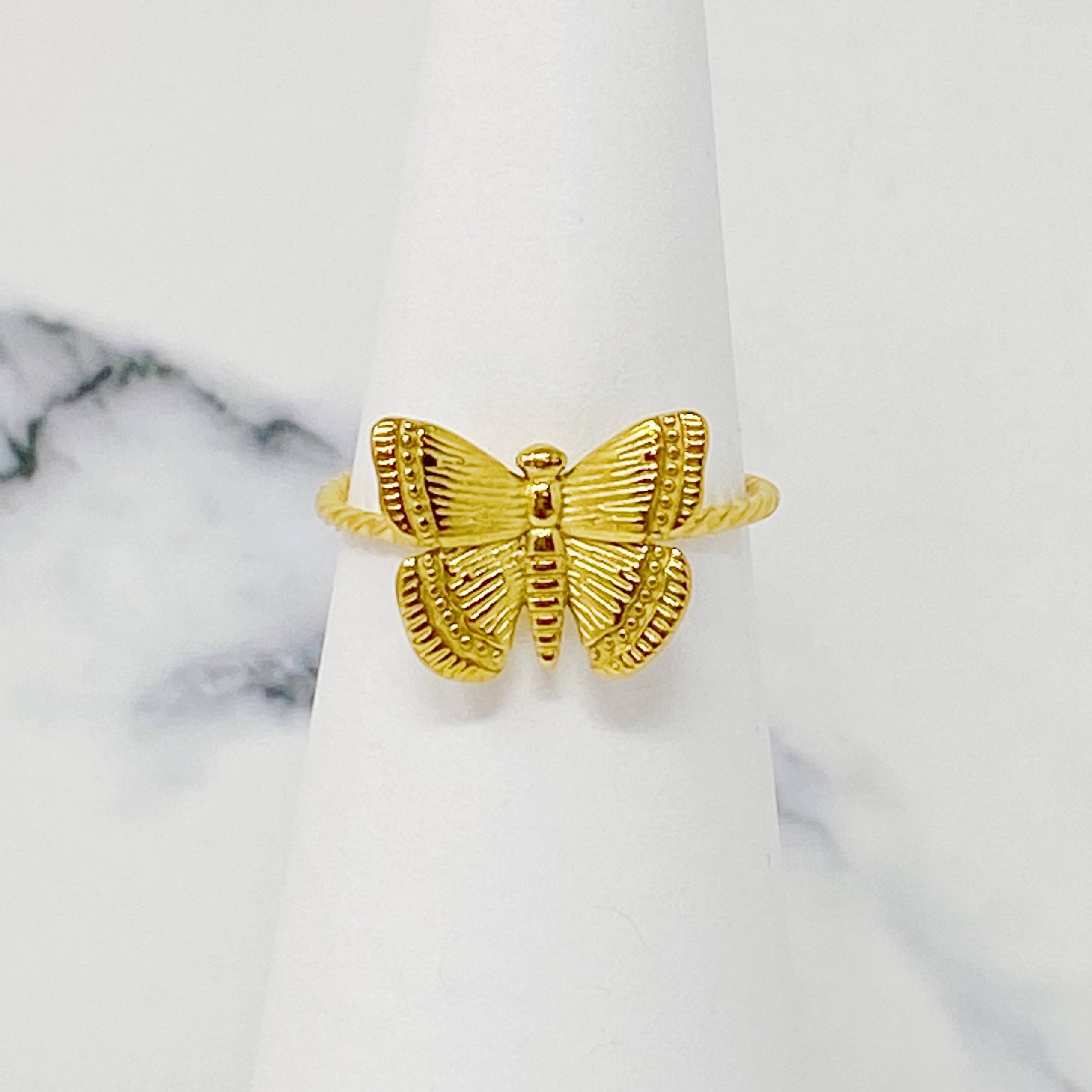 Gorgeous butterfly on the ring that looks like it would fly. Open adjustable ring that looks stylish on any finger that fits. 18K gold plated Stainless steel that last long with no tarnish Overall dimensions: 0.75” x 0.5” x 0.75” Made in China